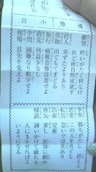 今日は早起きして、午前中から新春セールに挑むことに!!(昨日ほとんど寝ないで泣いていたから、目がパンパンだったけど・・・)足を伸ばして、池袋まで行き、順序良くデパートを回って、無駄なく、満足行くセール結果を出せたと思う(笑)大物は買わず、派手物も買わず、堅実に、ベーシックなものを、買い足せて満足満足♪欲しいと思い続けているショルダーバッグは、いいのが見つからなかったから無理せずあきらめた。4時間かけて、一通り回って気が済んだので帰ることに。地元に着いてから、その足で近くの神社に初詣に行くことにした。5円玉を握り締め!(笑)新年だから、気を引き締めて、おみくじも引くことに。結果はこちら↓「小吉」・・・。微妙・・・。しかも「運気容易に開けず口舌多し。急がず時の到るを待ちて事を行え。 脇目をふらず正直に働いて、信神怠りなければ自ら幸福が来ます。」ですって。真面目にひたすら働けってことかな・・・。恋愛:この人を逃すな縁談:調いかけて破れる。人にまかせればよいようになる。そうか・・・。「この人」を逃さないようにして、調いかけるのに、破れる、ってことか?それを人任せにすれば、望みはあるってことなのかな??う~む。とにかく2008年も、普通に真面目に生きていくかな。
