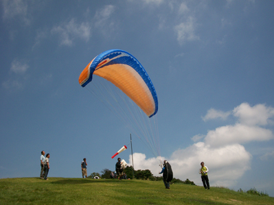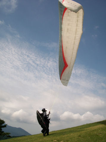 みなさま、あけましておめでとうございます。今年もよろしくお願いいたします。年末、久しぶりにCOOに行きました。パラの道具の処分や、ご報告などを兼ねての7月以来のCOOです。相方も連れて行き、みんなで楽しく?飲みました。さらに次の日はタンデムもしてくれました。ところが最初は私も相方も、私だけがタンデムすると思っていました。「寒いから」とフライトスーツを渡された時は彼も私も単に防寒のためだと思っていました。それを着終わるか否かの時、もう一つ渡されたのがパッセンジャー用のハーネス。「これもつけさせてね~」と言って渡されたので、そこで初めて相方もタンデムするのだと気づく。でも急いでいたので着終わった相方にすぐさにハーネスをつけ始める私。そして初めて相方も自分が飛ぶことに気づく。「俺飛ぶの? 聞いてないよ」「まぁまぁ。「つけさせてね」って言われたんだからしょうがないでしょ」「そんなこと言われたって・・・」「ほら、もう(イントラさん)待ってるから。急いで」つけるや否や周囲に促されるままグライダーの方へ移動する相方。そして私もハーネスをつけてグライダーの所に行き、装着してテイクオフ!続いて相方もテイクオフ!テイクオフしてすぐに相方のグライダーに近づいたので「おーい」と呼んでみると、全く持って微動だにしない相方。完全に硬直しておりました。そりゃまぁ、自分が飛ぶと知ってわずか10分かそこらで飛んでしまったのだから、全く心の準備というのができていなかったでしょう。ちょっと可哀想になったが、もう飛んでしまっているのでどうしようもできません。とりあえずフライトを楽しんでくれ、と心の中でつぶやいて自分は楽しむことに。久しぶりだったのでテイクオフは足がガクガクするくらい緊張したけど、やっぱり飛んでいる時はとっても楽しいですね♪また機会があったらカムバックしたいなと心の中で思いました。ランディングはやはりスポーツやっているだけあって、きれいにランディングしていた相方。そして私はというと・・・座ったままの状態で、いきなり直前になって「はい!前に足出して! 走って!走って!」と言われて「え? え?」と言っているうちにそのまま二人でハーネスランディング~。そして「何やってんだ、おまえは」とお叱りがぁぁぁ。でもホントに楽しかったです。そしてみなさま二日間ホントにありがとうございました。またタンデムだけでも来ようねと相方も言っていたので、時々はおじゃまさせていただきます。これからもよろしくね~!!!