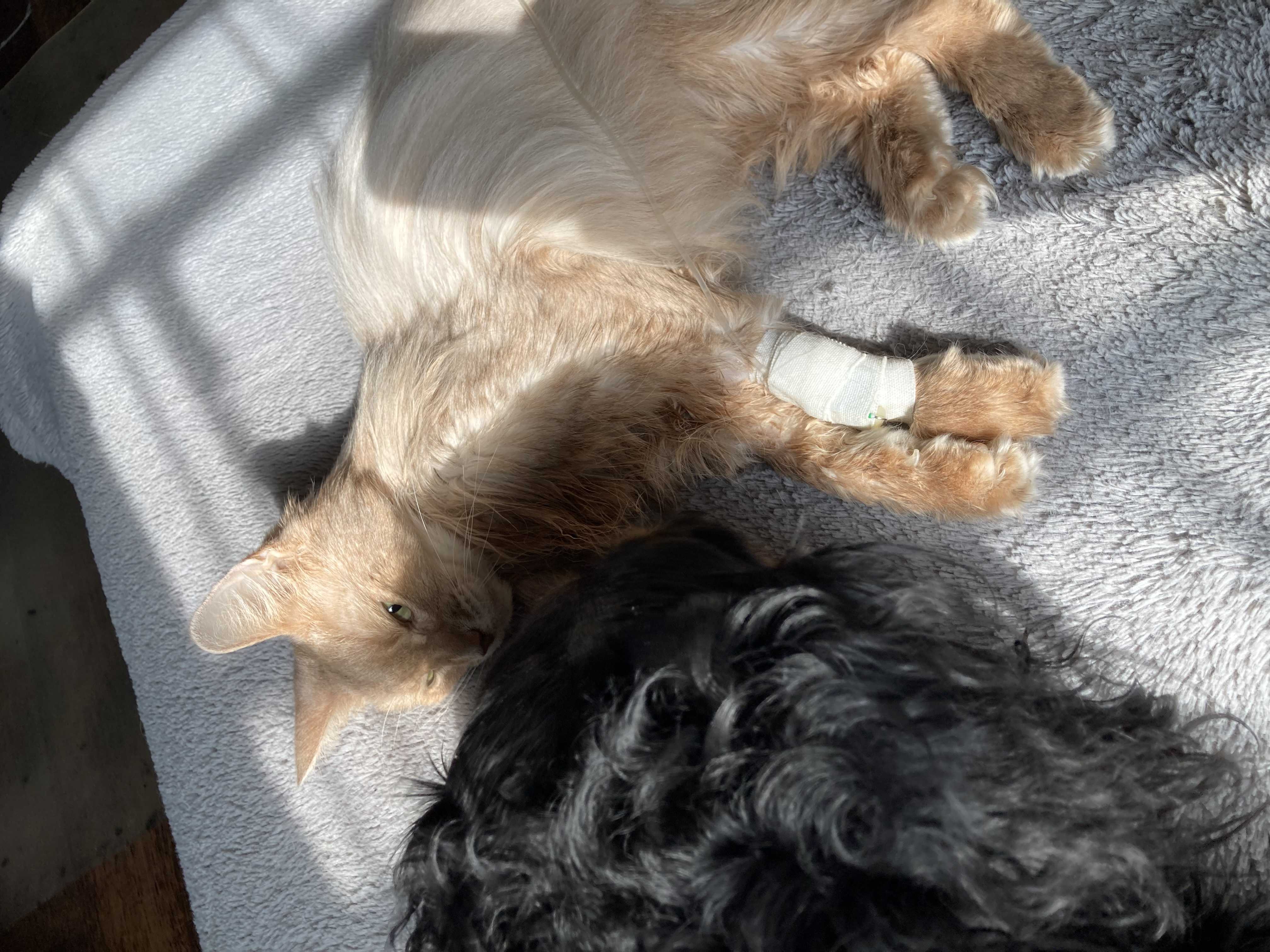 ども今日は、モナカの病院日でしたあれから毎週通ってるw今も家で静脈点滴してるんで替えの栄養剤と化膿してた腕と点滴をもう1本の足へ切り替えに行ってきた両前足の点滴は使用済みで後ろ足1本目も終わってもう片方の後ろ足で点滴してるんだけど、次は…どこだろう?また前足になるのかな最初の静脈点滴の傷口から化膿しちゃって皮膚が破けたのか良く分からないんだけど穴が開いちゃってたんだけど傷口に皮膚が再生する軟膏塗ってくれて今日も塗ってくれたwしかも、皮膚が再生するってだけにもう、穴が塞がってたなので、これは安心かな輸血してのここ1週間…ひ弱な感じだけど、自分でトイレ行こうと倒れながらも必死に歩いてるご飯は、ほんっと少量ながらも自分で食べたい意欲があるらしく食べようとして食べてた…けど、食べると嘔吐が始まってそれまでは無かったんだけど…3日前ぐらいから吐いちゃう…吐いた後ってしんどくなるんだろうねしんどそうにしてる今日の体重も2k食べて吐いちゃうし全然増えないよね静脈に点滴で栄養剤入れてるとはいえ自分の口から食べて栄養になる方がいいんだろうけど腫瘍でお腹に隙間無いのか食べ物を通らしてもらえないのだろうか…食べると辛そうになってきてる吐く前は食べた後も大丈夫そうだったんよね食べ物がお腹に溜まっていくとしんどくなる感じ腸が機能してないから余計に溜まるのかも今日は病院行って疲れただろうし少し自由にさせてる下に少しヨダレついちゃってるけど笑お気に入りの場所で寛いでるでも毎回思うんだけどあの中治りがあって、たったの2日間だけで余りにも可哀想で…って思ってたんだけど輸血のお陰で少しはモナカがやりたい事ややりたかった事がまた出来て…こんな事がもう出来る事は無いって思ってただけに…本当に嬉しいドナー猫ちゃんにありがとうって思うしモナカにも頑張ってくれてありがとうって思うし先生達にも色々考えてくれてありがとうって思う。今のモナカが爪研ぎ出来たりアクビしたりも当たり前じゃないんよね⤴︎これが出来たの見るだけで嬉しくなるよね😿色んな事にありがとうって思う🙇♀️そんな中…いつもと変わりなく白目で爆睡してますwwノンのカットもしないとなーモサモサねwでわ