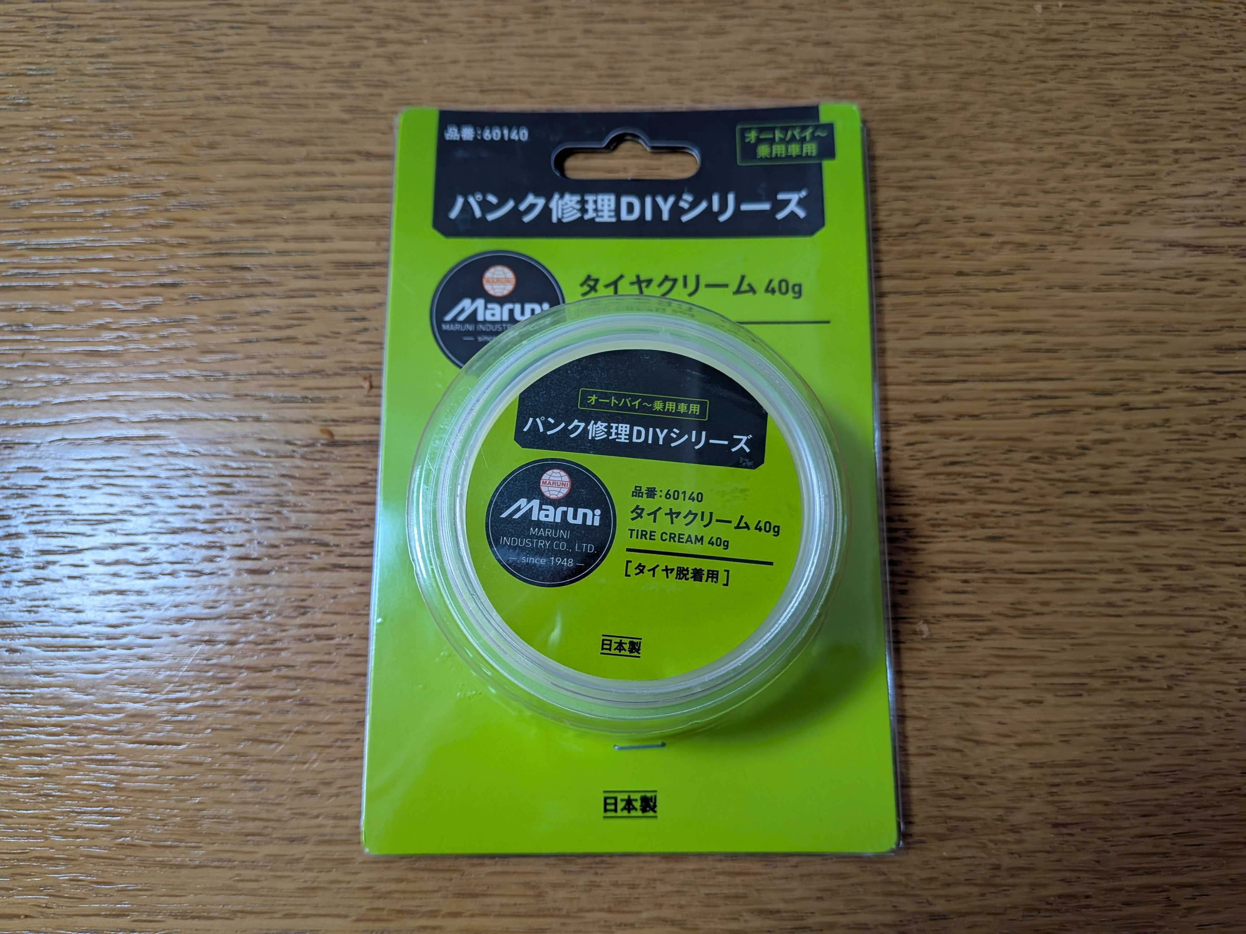 チューブレスタイヤのビードを上げるのは簡単ではないようです。私はそこまで難しいと感じてはいませんでしたが、先日出先でパンクしてチューブを入れたときに、出先でビードを上げるのは無理だと実感しました。チューブレスタイヤにチューブを入れる際の注意点そこでビードワックスの出番です。実はチューブレスタイヤにチューブを入れて使うことについて調べていたら、たまたま見つけました。そして買って使ってみたので、ブログを書きます。ビードワックスとはビードワックスとはタイヤの取り付けを楽にするための道具です。ビードに塗ることで、リムとの摩擦を減らして滑りをよくし、リムに嵌めることを楽にします。そしてビードの滑りがよくなるので、空気を入れてビードを上げるときも空気が入るとともにスムーズにビードが上がります。クルマやオートバイでは一般的に使われており、ホームセンターにも置かれている商品です。そんな便利な商品があるなら試してみたいと思い、ホームセンターに行って買ってきました。私が買ったのは近所のコーナンに置いてあった自動車とオートバイ用の製品です。調べたところ上記の製品を自転車に使っている方もいるみたいなので、買って試してみることにしました。ちなみに上記の緑のパッケージの製品はタイヤクリームと書かれていますが、ダイヤ脱着用とも書かれています。調べたところ、タイヤクリームはタイヤを磨く製品で、ビードワックスはタイヤの脱着に使う製品のようです。よって上記の製品がややこしい表記をしているようです。ちなみに同じマルニというメーカーから、対象に自転車も含むビードワックスも出ているようです。マルニ(Maruni) 工業 タイヤビード部用潤滑剤 ビートワックス40g B.PW-109価格:830円(税込、送料別) (2025/7/6時点) 楽天で購入 他にも黄色いパッケージのものもあるようです。青いパッケージとの違いはちょっと安いことくらいで、説明を読む限りは他の違いは解りません。マルニ(Maruni) タイヤクリーム(ビードワックス) 40g 60140 STRAIGHT/36-775 (STRAIGHT/ストレート) 楽天で購入 チューブレスタイヤの取り付けも楽になった早速ですがパンクしたチューブレスタイヤに裏からパッチを貼って修理しました。チューブレスタイヤの取り付けを行う必要があるので、ビードワックスを急いで買ってきたのでした。ちなみにチューブレスタイヤのパンク修理をパッチでやる方法はこちらを参照してください。チューブレスタイヤのパンク修理をパッチでやってみたまずはチューブレスタイヤのビードにビードワックスを塗っていきます。両側のビードにぐるりと一周塗りましょう。ビードワックスにスポンジが付属してきますので、スポンジにビードワックスを付けて、チューブレスタイヤのビードに塗っていきます。そしたらまずは片側だけリムに嵌めて、リムの溝に落とし込みます。続いてもう片方のビードをリムに嵌めていきます。ここでいつもは最後の方が硬くて嵌めるのが大変なのですが、ビードワックスとゴム手袋で一気に上がりました。思ったよりすんなりとタイヤをリムに取り付けられたので意外でした。取り付け時にも効果があるようです。ちなみに塗った量は軽く表面をコーティングする程度です。べっとりと塗るようなことはしていません。ビードがビックリするほど楽に上がったそしたら次はビードワックスが乾いてしまう前に空気を入れてビードを上げます。最初にバルブを引っ張りましょう。タイヤを嵌めるときはバルブを少し持ち上げた方が楽なのですが、そのままだと空気を入れるときにリムの穴を通って空気が漏れて行ってしまいます。よってバルブをしっかりと引っ張り、リムとバルブの間に隙間ができないようにします。そうした上で空気を入れていきます。驚くべきことに、クリンチャーに空気を入れているかのようにすんなりとビードが上がってしまいました。ビードワックス恐るべしですね。石鹸水とは比べ物にならないほど手間がかからず、まるでクリンチャーに空気を入れるがごとくビードが簡単に上がるなんて、今まで石鹸水でやっていたのは何だったのだろうと思えてきます。こうなるともはや石鹸水には戻れず、ビードワックスを愛用し続けることになるでしょう。ちなみにビードワックスは10分程度で乾くそうです。取り付けからビード上げまで時間がかかってしまった場合は、リムとタイヤの隙間にビードワックスを塗ってあげる必要があるでしょう。またこれだけ楽にビードが上がるのなら、出先でパンクしてチューブを入れる際も安心ですね。出先でビードを上げる方法は、どこかで洗剤や石鹸と水を借りるくらいしかないですから。そしてビードワックスの器は小さいので、サドルバッグに予備チューブとタイヤレバーと一緒に入れておけばいいでしょう。終わりにビードワックスを使ってみて、こんなに便利なものがあることに驚きました。これでもうチューブレスタイ
