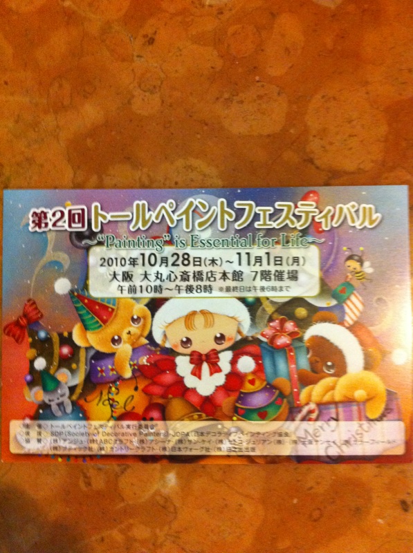 関西では、心斎橋大丸で、「トールペイントフェスティバル」が来週から始まります。わたしも、お手伝いに行きます。あ、作品もクリスマスをテーマに、出しています。ハートにピンクのポインセチア、うさちゃん、ご存じのかたは、見つけてくださいね。心斎橋にお買いものついでにお立ち寄りください~