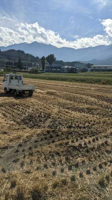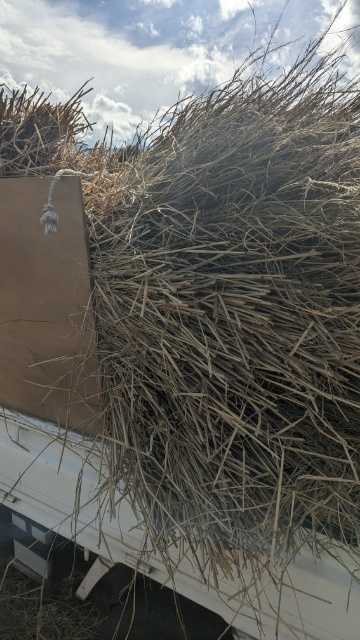 一列に並んでいる 藁を何箇所かに集めて 軽トラに積んでいきます。