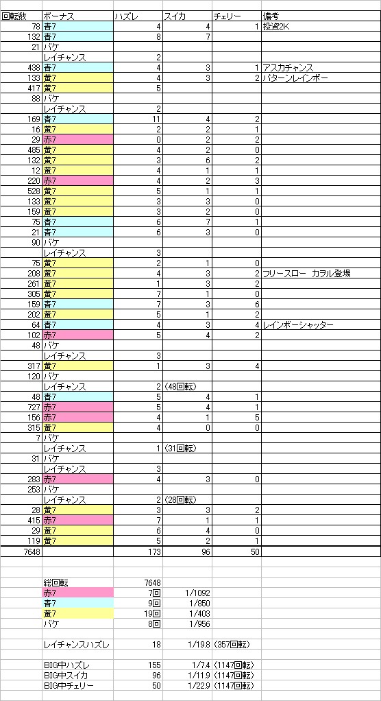 蒼井です、こんばんはw今日は7の日でしたが、キャプから「遅刻するので、代わりに練習を仕切ってください」との依頼があったのでサボれず(汗)今日は行けそうな気がしたんだけどな・・・角台狙って大勝っていうイメージがものっそ沸いていたんだけどw(イメージだけはね)ということで今日は6の日の稼動を書きます。10/6この日は蒼井が6の日しか行かない店のイベント。普段は全然出ませんけど、6の日は全機種熱いw8時ぐらいから並べるように起きるはずが起きたら8時40分(汗)こりゃ開店時間がやっとやな・・・ということで開き直って開店時間ジャストに到着。昔はものすごく並んだんですが、最近はそうでもないので、開店時間でも空き台はかなりあります。で、唯一打てる5号機「エヴァ3」を打とうかなと思っていると、空き台が2台。この店はほんとに上げる台が読めないのですが一年通って気づいたのが、「前日ある程度回っててハマってる台と、1000回転未満でノボナの台は、ある程度回ってる台の方が上がりやすい」ってことぐらいなんですね。それも絶対ではないのでよく読みが外れる訳なんですが。といっても今日は選択肢としては2つしかないので、前日により多く回ってる台に着席。すると投資2kの78Gで早くも青7(σ^∀^)σゲッツ!!さらに132Gで再び青7降臨(・∀・)ニヤニヤ・・・偶数は間違いないな(*´m`)クスクスさらに21Gでバケを引いて、そのレイチャンスでハズレを2回引く。ゲンドウ「ああ間違いない、4か6だ」と見切ったので頑張って回すことに。もしかしたら6かもしれんな・・・(゚∀゚;*)ドキドキなんて妄想していたら。その後が青7↓黄7↓黄7↓青7↓黄7と来まして。ゲンドウ「ああ、間違いない。4だ」まあ4だとしても、データを取るにはいい機会だから一日ぶん回そうかなと思ったわけです。ところが、普段パチばかり打ってるせいか、スロを打つとめちゃくちゃ疲れる(;´Д`)ノご飯は食べなかったのですが、ちょいちょい休憩を取ったせいで、あまり回せませんでした(汗)ということで、以下データです。このデータを見ると結構微妙なんですよねー。ボーナス比率、ボーナス確率、レイチャンスハズレは6だし。BIG中スイカ&チェリーは4ぐらいだし。通常時のコイン持ち&ベル確率も調べないとあかんかったな。(パチパチくんが無いので、断念しました)とはいえ、出玉はこんなもんでして これは6の理論値通りかなと。プレミア演出はいくつかありましたが撮れたのはこれぐらいでした(汗) ということで結果は投資 2K回収 70k(5.5枚)収支 68Kとなりました。途中で肩は痛くなるし頭痛も始まるし、止めたろうかと本気で思いましたけど、結局ほぼ最後まで打ち切りました。最後の方はちょっとハマりましたけど、ラストの2回でほぼピークまで戻せましたし文句の無い稼動でした。しかしボーナス中の子役を数えるのってほんまめんどくさいですね(^_^;)でもこれがあったから「4以上は間違いない!」という自信を強められたので、やっぱり数えてよかったなと♪こうして日記のネタにもなるしねwということで10月初稼動は、なかなか良いスタートを切れました。明日も起きられたら打ってきますw6ツモって練習さぼったろf(・∀・)テヘでは今回はこの辺で!!
