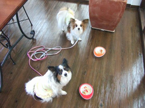 今日は昨日とうって変わってイイ天気気分も爽快+.(*'∇'*)゜+.でもそんな晴れ晴れしい気分を打ち破る電話が朝の8時半にかかって来ました。これから我が家に嵐がやって来ますllllll( ̄∇ ̄;)lllllザー 超巨大ハリケーンしかも夫婦(めおと)です。そんなんで朝からクレージュは大忙しあそこも掃除しなきゃ!!あっここも!!って早送りみたいにハイスピードで動きまくりました。やれば出来る女です=^∇^= にぃおうちも綺麗になった所でおりこうに待ってたクレジュピたんの為にいつもより多めにお散歩してあげました。そして自分の気晴らしも兼ねて家から徒歩1分の所に新しく出来た“ドックカフェ”を偵察!≡≡≡ヘ(*--)ノカフェって言っても前からあるペットショップ内に出来ただけのこじんまりしたもので、ややしょぼでした。メニューもドリンクとケーキのみで軽食は無し(_ _。)しゅんでもわんこご飯はいっぱいあったなぁ~。偵察の記念にクレジュピにはささみ巻き○○を特別にオーダー♪いつまで待てばいいでちゅか( ̄¬ ̄)じゅるるヨシ!!お味がかなりお口にあったみたいで1分で完食~んでご覧の通りの超笑顔~。ジュピも~。 あー満足満足♪また連れて来てあげるからね~そろそろ嵐が上陸しそうなので今日はこれで終わりです。明日はクレジュピが着てるワンピの事でも書こうかな~。キリ番祭り開催ちぅーです。88888カウント狙ってくださいねキリ番まで あと 2081。