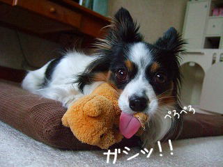 今日はものすごく忙しい1日ですたヨレヨレしてますクレージュです。こんばんは。そんなヨレヨレな1日ではありましたが実はすごく嬉しい事もあったんですよ~だ。^▽^ふふそそ、これこれ~おやつでしょ♪ステッカーでしょ♪♪それに おもちゃが2個~♪♪♪こーんなにいっぱい 頂いちゃいましたよ+.(*'∇'*)゜+送ってくださったのは ごんママさん&ごんパパさんです。ごんパパママさんはですね、いつも仲良くして頂いている ちぃめみさんの大の仲良しさんでちぃめみさんのブログ★So-NEっ子録★の準レギュラー(笑)なのです。つまり 私から見ると 友達の友達ですよ。その友達の友達から なぜに~?と?これには深い理由がありますの。ごんパパさん一家には 可愛いパピヨンちゃんが2匹おります。そして、どこかの誰かさんみたいに【壁】l_・チラ)彼らを 過激に溺愛しておるのです。その目に入れても痛くないほど 可愛い可愛い末っ子の“イヴちゃん”が去年の暮れにめでたく初ヒートを迎えました。やりましたぁ*・'゚☆。.:*:・'☆'・:*:.。.:*:・'゚:*:・'゚☆その話を聞きつけた私が ごんパパ&ママさんに『おめでとう♪』を言わせて頂き、おめでとうに喜んでくださった ごんパパ&ママさんが我が家にお届け物をしてくださったとゆぅわけなのです。あ~!!最終的に 私が1番喜ぶ結果になったのは何故なのでしょう。。。。なんだか 申し訳ない気持ちでいっぱいですよ。ご当地名産ボーロは 人間の娘が 食べる!!って言い張っています果たして、クレジュピの口に 入ることは出来るのでしょうか?おもちゃの方はですねんもーすごく気に入ったみたい。こんなに盛り上がって遊んでましたよごんパパさん、ごんママさん、本当にありがとうございました♪いつか一緒に遊んでくださいね*・'゚☆。.:*:・'☆'・:*:.。.:*:・'゚:*:・'゚☆♪