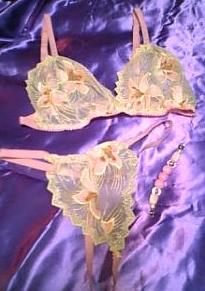 レースは薄いし透け透けです~♪そして、何故か「パール」が付けられるようになっています。珍しく淡い色で、薄いピンクです。これに白のガーターと白の網タイツのガーターストッキングを合わせてみました