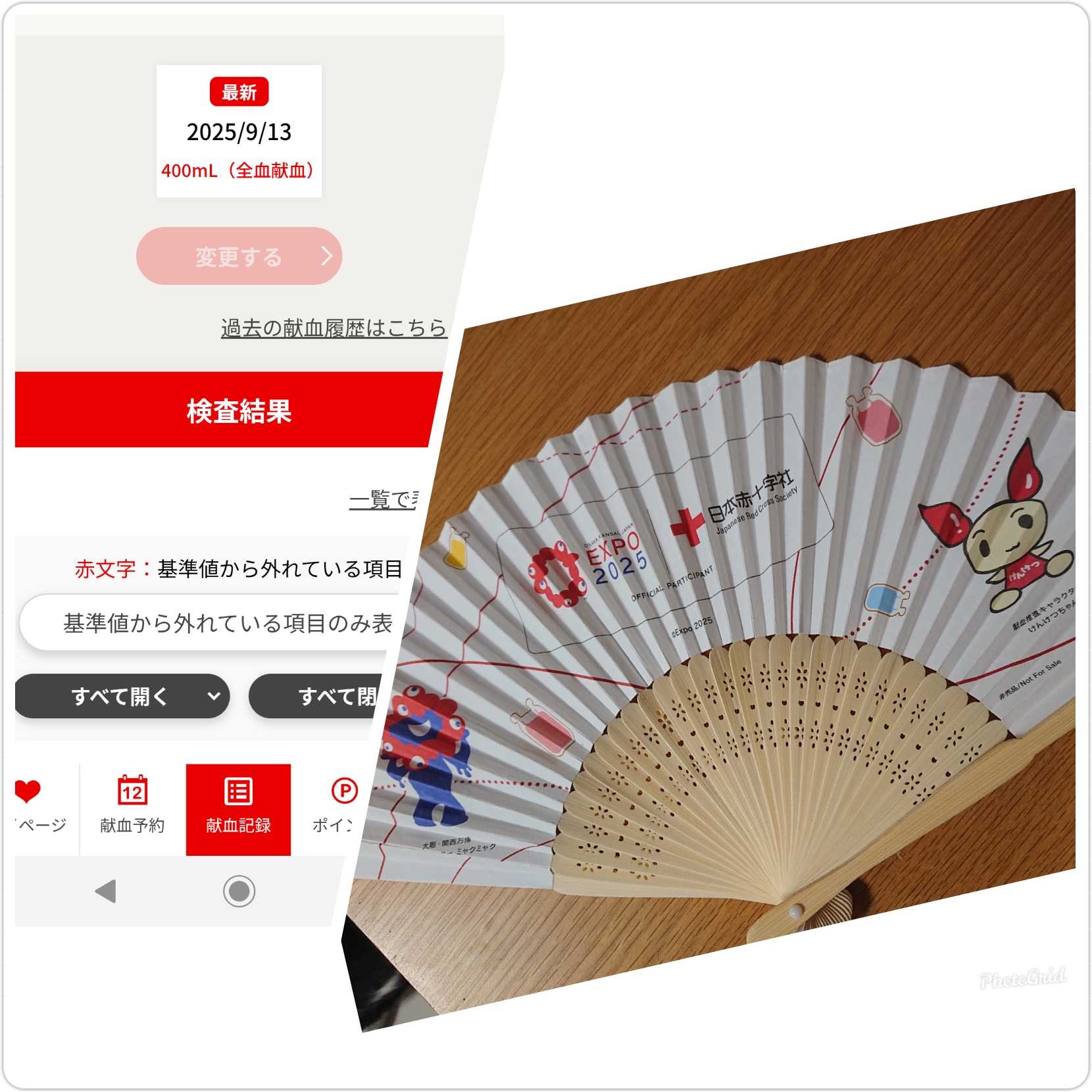 色々あった万博も明日で閉幕ですね。5回行った大量の写真とグッズをこれから整理していきます特にグッズはぬいぐるみのような大物は買ってないけどパビリオンでもらったものも含めたら結構な物量…さて、その万博の「国際赤十字・新月館」の展示に衝撃を受け(思わず泣いてしまったけど周りの人も泣いてた)「こうしちゃおれん、何かできることをしなくては!」という思いに駆られ、人生初の献血に行ってきましたもともと赤血球の数が少なく、健康診断では常に「貧血」の「E判定」。日常生活で別に支障もなく低空飛行で生きてきたんだけど、50歳を過ぎて体の変化により正常範囲になりました。これは…いけるのでは?と早速Webから申し込みをして献血センターへ。血液検査と問診を経ていざ献血開始!「ふらついて倒れたりすることがあるので、電車でお帰りの際はホームの後ろの方で立っててください」とか「次回の献血までは4ヵ月あけてくださいね(体が元に戻るのにそんなにかかるの…)」とか言われてビビりながら帰宅しましたが特に異常もなく元気に過ごしております。初めての献血でおみやげいっぱいもらったうえに万博キャンペーンで特製扇子もいだきました。後日届いた血液検査の詳細もすべて正常値!また行くぞ。歯科と眼科の定期健診も終えて「メンテ完了!出動態勢入ります!」って感じです。