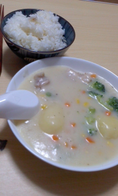 その間に、鍋を熱して油をひき玉ねぎスライス(冷蔵庫の冷凍ストック)を炒め、同冷凍ストックの鶏肉とミックスベジタブルを同じく炒める。