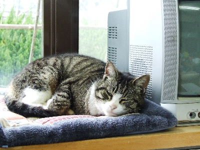 お客様が働いている、岡垣中央霊園の管理所のボス「ミー」です。13才の♀です。毎日暖かい窓際が指定席。お参りに来られる方々にも人気のニャンです。「満足ニャン!」