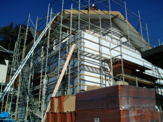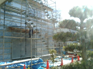とっても見にくいですが、西と東の窓の上に霧除けが完成!(画像は、屋根のガルバ乗せ前!) 霧除けの屋根部分には、サッシと同じような色(シルバーベージュ?)のガルバを乗せていただきます! ホントは、ここも瓦が良かったんだけど、重量的にNGだったみたい。。 残念。。 でもでも、カッコイイ仕上がりになりそうです! *cotori*