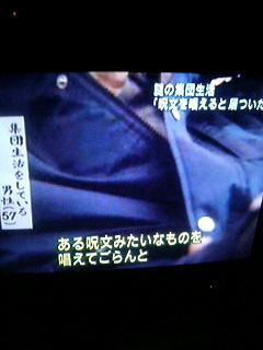 オスマン・サンコンが消えたのも暴力沙汰だった。ボビーとムルアカの証言が食い違っているが、目撃者は一様に口を揃えて「ボビーが暴れた」と言う。ムルアカに殴られて唇を切ったと主張するボビー。いったん、ウソをつくと、謝っても許されないぞ。ノックみたいに。慌てて、写真を撮ろうとしたが、ベタ扱いですごくこのニュースが短くて間に合わなかった。でも、次のニュースがおもしろかったのでスクープ。「呪文を唱えたら、10人の女が自分の周りに居ついた。」このおっさん(57)は、ある夢を見て、それを実行したらモテモテになったと言うのだ。どーせ、オバハンばっかりだと思ったが、20代もけっこういる。やっぱり、気になるその呪文だが、レポーターが質問してくれた。「具体的に呪文の内容は?」「怖くて言えません。」ズルッ。(←こける音)さっそく実行しようと思ったのに~。爆笑