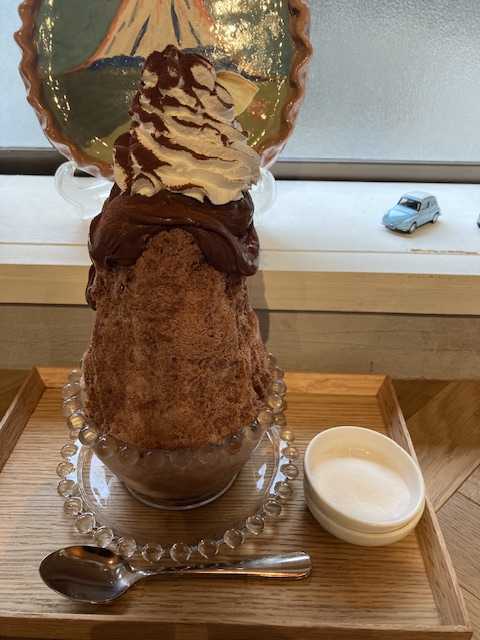 5/17に、弟と一緒に、川越市までドライブした。弟から川越市までドライブしようと誘われた後、ココア専門店のcocowaの存在を知り、ココア専門店は珍しくて、行って見たくなったので、弟にcocowaも行きたいと提案したらOKしてくれたので行った。cocowaでは、ココアとスイーツのセットを注文するつもりでいたが、店内でかき氷の旗を見かけ、かき氷をやっているのですか?と尋ねたら、注文OKですと言われた。弟はココアとスイーツのセットを注文し、僕はココアのかき氷を注文したが、僕も本当にかき氷好きだなあと思った。弟にココアを飲んだ感想を聞いたら、ココアそのものは甘くないけど、マシュマロで甘くなっていて飲みやすいそうだ。かき氷は、結構高さがあり、たっぷり味わえるのは嬉しかった。結構甘いと感じた時は、塩をかけてみてくださいと言って渡された。上の生クリームは甘かったが生クリームに塩をかけるのもどうかと思いかけなかった。ココアの粉がかかっている部分に塩をかけたら、意外に塩味を感じた。ココアの粉に甘味はなかったが、それでも美味しかった。ある程度食べたら、クッキー・コーヒーゼリー・マスカルポーネチーズが底に隠れていて、思わず興奮した。どれも美味しくて、店のかき氷は最後まで楽しめるのが素晴らしいと思った。僕が座った席は、トトロの置物や山の絵が描かれた皿等が飾られていて素敵だった。テラス席もあったが、その日は雨が降っていたので、流石に選択肢にならなかったが、暑い日ならテラスでかき氷を食べてもいいだろう。落ち着いた空間で、弟と久々に色々と雑談ができたのも良かった。機会があれば、今度はココアを飲みたい。かき氷と店の写真を載せておく。