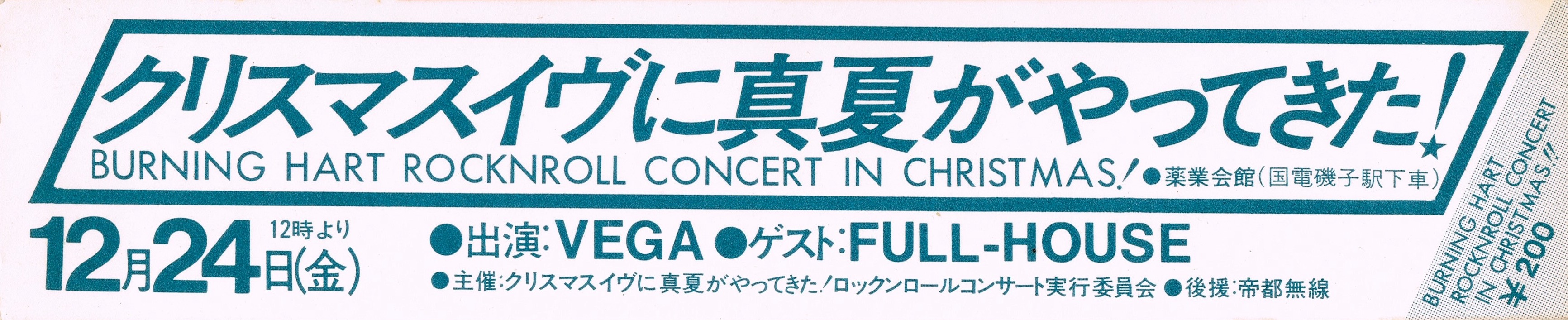 田口:セニョール広石:うっはっは!吉田:セニュールって呼ばれてたし紫やってたじゃんウチら髙島:やってたね吉田:だからぁ、ジョージ江戸むらさきって名前ついてたもんね www田口:う~んふふっふ ww吉田:ほっほぁはっはっは www バカだねぇ www広石:バカだねぇ髙島:異名つけんの上手かったよね吉田: www 早かったよね、早かったし上手かったし・・・広石:あ~誰だろ、気になんなぁ・・・髙島:んなその広石バンドねぇ?広石:うん吉田:名前忘れちゃったなぁ田口:でもそこでだから広石と逢って広石とも交流ができたのかも吉田:できた、そいで、そぃなんだかんだ云って8月終わったじゃん?。ライブ終わってぇ、で今度やったのが11月の野音なんだよ。・・・で野音でやったバそれもエイプリル、っていうかフルハウスか、がトリでぇ。ウチら出てぇ・・・広石:あそれ覚えてる吉田:それでフェンダーも、オフェンダーも出たの広石:オーフェンダーって書いてあったんだよね吉田:お~フェンダー!<一同笑う>吉田:お~フェンダー www田口:あっはっはっはっ www広石:思い出した、俺も。チケットにオーフェンダーって書いてあって・・・フェンダーがねぇ、高くてビックリしたってゆぅ吉田・田口:あっはっはっはっ www吉田:でぇ、そぉん時それでぇ、タコヘンはぁ、一回ねVEGA離れたんだよ。田口:ほんとぉ・・・髙島:えぇ!?吉田:ほいでウチらはVEGAって名前でカセくん~てゆーベーシストが入ってやったの。田口:お!~~カセくんカセくん吉田:でタコヘンはぁ、あのねぇ、もっと上手い人がぁやりたいってゆーんでドラムがぁ・・・あの、横浜銀蝿じゃなくて銀蝿とかゆーさぁ。広石:銀蝿ね吉田:銀蝿ってこの、ハードロックのぉ。田口:うん、うん、それがゆー、あれじゃない?吉田:叩いてた男の・・・広石:藤沢銀蝿の方だ吉田:藤沢銀蝿の方田口:なんか藤沢、そうかぁ・・・吉田:でそれで、イシイちゃんがギターでぇ、田口:イシイちゃんギター・・・吉田:イシイちゃんでキーコでぇ、でイシイちゃんギターボーカルかな?。そいで何とかって、バンドで組んで出た。同じ時に・・・VEGA名義じゃなくて田口:あのさ、横浜銀蝿だっけ?吉田:横浜銀蝿は横浜銀蝿・・・田口:ぇじゃんじゃんじゃ藤沢銀蝿の、に~つっとな、こ~んな髪型した人居たよね・・・吉田:そうそうそう!こんな、長い髪、ロン毛の男の子。ドラマーでね、ほいで一回やってんだよね。髙島:それは?ボーカルNOBUでぇ・・・吉田:いやっ、きっ、チンジだよ。髙島:えっ?吉田:ほん時はもう信二・・・また復活髙島:タコヘーが居ないVEGA、でやってんの俺ぇ・・・吉田:うん、だから一回その8月はNOBUでやったの田口:うん吉田:で8月でやってぇ、やってぇ・・・あんまりねぇ、音程が良くないからってゆんで。田口:そうそうそう!吉田:タコヘーが、やっぱ信二だなぁっつって www田口:あっはっは信二だなって、信二だなぁっつったんだ俺 www広石:なんだかわかんない高校生なんだはっはっは www髙島:でも、俺が戻ったら自分が辞めてんでしょ?吉田:そん時辞めてんの田口:あっはっは、そう髙島:そうゆー事だよねぇ田口:そうゆー事かぁ・・・広石:おんもしれぇな高校生田口:その、銀蝿の人のら覚えててって、銀蝿ってその人、ドラムぅ・・・でギターイシイちゃん?吉田:うん上手かった、イシイちゃん。イシイちゃんくるむキーコ、うん田口:キーコ、でやったん・・・そこでそうか、そのその時点。藤沢銀蝿のとーが出てくるのか。俺の記憶ん中に・・・吉田:そうそうそう広石:んふふふふん・・・みんなで協力するといろいろ解ってくるんかな・・・田口:クリスタルレイクのドラムの人じゃないよね?吉田:ちぁう、あれぇ~は岩間くんだもん田口:岩間くんだよね広石:あ~岩間くん・・・シンバルこーなた高くして田口:そう! www んふふふふふ吉田:くくくくく・・・www広石:そうだよね、ラカタカタカツチャチャァ~ン・・・やっつたよね!Wwwwwww<一同大爆笑>吉田:あははははは!やっってたやっってた!広石:一時期アッチャンと付き合ってた・・・田口:うん、アッチャンと付き合って・・・忍足吉田:忍足アッチャンと広石:あ思い出した思い出した髙島:そーえば云っつたねぇそれねぇ吉田:懐かしいなぁ、そうだから、VEGAの歴史はそんな感じだよね・・・だぁ高1の一月、11月か。11月ぐらいまでそれでやってぇ、それからVEGAとしての活動がたしかないはず。でそっから、みんな、あっあるゎ!。そのあと放送局ができたんだ、放送局できたからってゆーんで、タコヘンがまた戻って来てぇ。髙島:戻って来たんだ田口:うん吉田:戻って来てぇ、ほいで、あぁのぉハイスクール・ロックンロール・フェスティバルつーの。山本さんがやっつたじゃん広石:横浜ハイスクール・ロックンロール・フェス・・・髙島:いっしんやまもと吉田:そう、でそれでぇ、アルバムを作ろうかてゆう、みんなで、オムニバスのCDあぁ・・・LP!。田口:LP!吉田:でもぉ、ウチらはぁ、やんねぇ!っつって。デモテープ録るっつってぇ、そのぉ、アルバムに