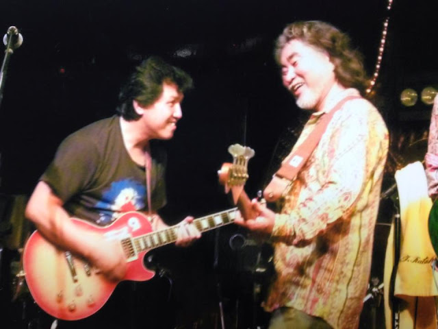 田口:うん・・・このナス型のじゃないんだよ、ナス型のあったじゃんなんか。髙島:ヘフナーの?田口:うん、なんかこんなナス型の、あれじゃなくてね髙島:それを?買っ・・・た、買ったんだ田口:うん買った、うんうん、それでベースを始め。まだこんな黒いナイロン弦でね髙島:あ~~~ん田口:ラウンド、ラウンドワウンドなんてないわけよ、黒いやつ、黒いつるっつるのさぁナイロン弦だよ髙島:つるっつる!田口:つるつるつる・・・フラットワウンドみたいな感じ髙島:巻いてないの?田口:巻いてない、つるつる・・・つるっつるの弦 髙島:それ何か、何かあれでしょ、プラスチックだか・・・何だ・・・田口:そう、ナイロン?髙島:ナイロンか・・・田口:今みたいにステンレスとか、そーゆんじゃないだ髙島:じゃないんだ・・・じゃ、くーん、くーんって感じか www田口:そうそうそうそう www ・・・そう、そーれから始まったんだよ。まぁギターもなんか、御茶ノ水で。だぁキャン、キャンダってゆーメーカーの?イシバシの、イシバシ楽器だったのかな?神田し、神田商会か・・・それ文字ってキャンダって髙島:キャンダってあったね、うんうん田口:あったでしょ、ハミングバード、ギブソンのハミングバードみたいな。あれを買ったんだよ、最初にな。だその後だベース買ったの。髙島:あ~なるほど、順番としてはそう・・・田口:そう順番としては・・・髙島:ふ~ん、でブリティッシュ・ハード、はパープルが好きだったんだ。田口:そうだね・・・あれツェッペリンのさぁ映画あったじゃん。あれってさぁ、やっぱ俺らがさぁ、中学2年とかさぁ、中1とかさぁ、そのぐらいだったよね・・・俺見に行ったんだよ、ケっ、ケンタと。桜木町?伊勢崎町にまだあの頃映画館あったじゃん?髙島:俺行ってねぇわ田口:あそこにね、見に行った。 髙島:ふ~ん田口:そ、見に行った見に行った・・・ほんで、ジミー・ペイジかっこいいなぁみたいな。うん、そりゃまあロックの、圧みたいなものが・・・気持ちよかったんだね、だからね。髙島:でも、ジョン・ポール・ジョーンズ、だっけ?ツェッペリンの・・・じゃなくてぇ、パープル、ロジャー・グローバーの方に行ったんだね?田口:の方が刺激的だったかな、最初はね・・・髙島:ちょっとアレ歪んでたの?田口:そう、うんあれは何かリケンバッカーか何かだったから髙島:あリッケンか・・・あぁあぁ、独特だな田口:独特独特~・・・かな。それからだから中学2年になって、ケンタとバンド組んでぇ。文化祭やってぇ・・・髙島:それは編成はぁ? 田口:俺じゃん、ケンタじゃん、あと出口くんって居たんだぁ・・・髙島:デンコー?あの翠嵐行った・・・あ、ああ、亡くなっちゃった田口:とぉ、そいつも、ドラムの宮沢ってゆーのもいたんだよ。覚えてる?髙島:宮沢ドラム・・・持ってたもんねアイツ?田口:持ってたんだよね、だからね。ツーバスのさぁ、裏抜きのさぁ、裏に皮張ってないやつ。なんか金色か、銀かさぁ、黄色かさぁ・・・黄色じゃねえな、ツーバスのさぁ ww もうメッチャクチャだと思うけどね?プレイは・・・髙島:プレイは・・・田口:メチャクチャだと思うけど、そんなんで六中で、バンドやったんだよ。でもまだその頃はロックミュージックが、やっちゃいけない!って云われるような音楽なんだからぁ。ダメだ、ギター持ってきちゃダメだどうのこうのって・・・俺なんかはできたんだけど、俺なんかの後の、下はぁ、ろ、ロックバンドは禁止されてたな。六角橋中学・・・う~ん髙島:なるほど・・・田口:そんで、ほんで何かナンダカンダで高校に行くわけだな。う~ん・・・でもう、勉強なんかしなくなっちゃったし俺も。もうろっ、ロック一辺倒になっちゃったから。う~ん、まぁ取り敢えず高校は、まぁ・・・髙島:あっちだよね?田口:そうそう〇〇○ぇ・・・麻布○○のね?髙島:あぁたぶんねぇ、その宮沢くんにぃ、ドラム借りたんだよね俺ら・・・田口:ぁぁほんと?髙島:俺らは俺らで、神奈川中学でバンドやっててさ。でもドラムがねぇってゆーアレでさ。ドラム吉浦だったんだけど持ってなかったのよ、最初にやる時は・・・田口:うんうんうん、はいはいはい髙島:でぇ、宮沢くんに借りようってなって・・・たしかリヤカーで持ってった。たしか・・・田口:あホント、ぁ宮沢が貸したんだ・・・あいつね、じどう、自動車整備工場みたいな。自動車中古屋さん、整備工場みたいな、街中の、自動車屋の息子だったんだよ・・・うん髙島:ふ~ん・・・トッポイやつだよね田口:う~ん、もう不良。もう六角橋の不良・・・・・・そう、六角橋の不良髙島: www でぇ、そうか、まだぁ、そうか俺、とやる前か・・・田口:う~ん、そうそう高校入ってぇ・・・髙島:ケンタは商大んとこだもんね、あそこのね、西谷のね田口:だからぁ、そっから横浜放送局にぃ・・・繋がってくんじゃない?学校でやってたぁバンドがぁ・・・そのなんか、ケンタの兄貴の、だからエイプリルバンド、から髙島:当時フ