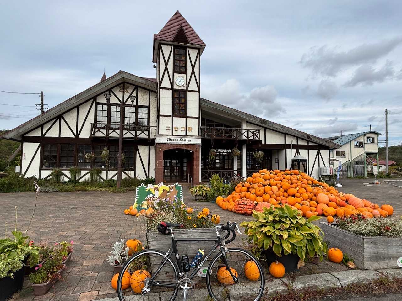 久しぶりにニセコに来たなぁ毎年恒例のハロウィン仕様あれ?前は馬車がなかったっけ?晴れ予報だった気がするんだけど曇っててすごい風この風は大丈夫?羊蹄山一周できるのかしらSL近辺もちょっと変わってたこんなに曇ってるのに羊蹄山きれいに見えてる珍しいねダチョウ牧場到着待ってて、餌あげる100円玉あったかな餌の袋を持ってると袋めがけて勢いよくクチバシが飛んでくるので怖い体が大きいのに頭小さくて脳みそも小さそうなダチョウかわいいいい顔するなあ!羊蹄山に負けてないぞ!真狩村あら?細川たかし生誕の地新しくなってる場所も少し変わったみたい羊蹄山をバックにキタキツネ!尻尾がふさふさ〜真狩の街から見る羊蹄山は迫力がすごいよ道の駅真狩百合根が有名あと、細川たかしもね!百合根ソフトと百合根コロッケいただきますソフトはねっとり系横にしてもクリーム落ちないこのねっとりは百合根なのかな?バニラの味が濃い〜のよコロッケは美味いな!百合根と塩のシンプルな味美味しいけど…ちっさいわ〜ルスツ方面へ向かってるのだけど風が強すぎてこ、怖い突風の横風トラック通ると怖すぎるどうしよ、帰ろうかもちっと行こうか留寿都村けっこう登ってきたぞ風がずっとやばいショートカットしよう道道257号線登りは2キロ弱再び真狩真狩の街から見る羊蹄山はいびつだけどここから見るとキレイな形だな〜真狩へのショートカットができるの?もう風が強くて京極までしんどすぎる真狩へ行こうか羊蹄山一周じゃなくなるな真狩一周になっちゃうけどま、いいかどんな道かしらいい道じゃん!下ってるよ横風怖いのでスピード出さないけどお分かりでしょうか全ての牛が座っていますしかもほとんどみんな同じ方向に向いているみんな風が来る方に尻を向けて座っているのです賢いわ強い風の影響を受けないように座ってるのずっと下りでずっと車がいなくてずっと景色がいいのこの道はどこへ出る?出たところは真狩の街の中!さっき写真撮ったところだったランチにしよう初めましての小川屋さんカツが有名だった気がする真狩産ハーブ(ロース)豚のカツ定食 1680円豚美味いな〜肉柔らか〜ごちそうさまでした〜んじゃあ来た道を戻るぜダチョウ牧場の道の方が道道より車がいないから木があると風が少しラクよねニセコに戻ったよーニセコの街はキレイ今頃晴れてきやがったな駅の近辺はお祭り騒ぎ今月いっぱいはこの風景が楽しめるよ!根性がないので羊蹄山一周じゃなくなったけどずっと山がキレイだったからまあ、いいやこんな日もあるさっ今週末からの旅のお供に電動ポンプを手に入れたぜ皆さんもう使ってらっしゃるのかしら?旅にパンクはつきもの充電して使えるなんて、素晴らしいわね!まあ、パンクしないに越したことはないんだけどさ…では次回からは旅の様子をお届けしますとりあえず、台風は勘弁してほしいなぁ
