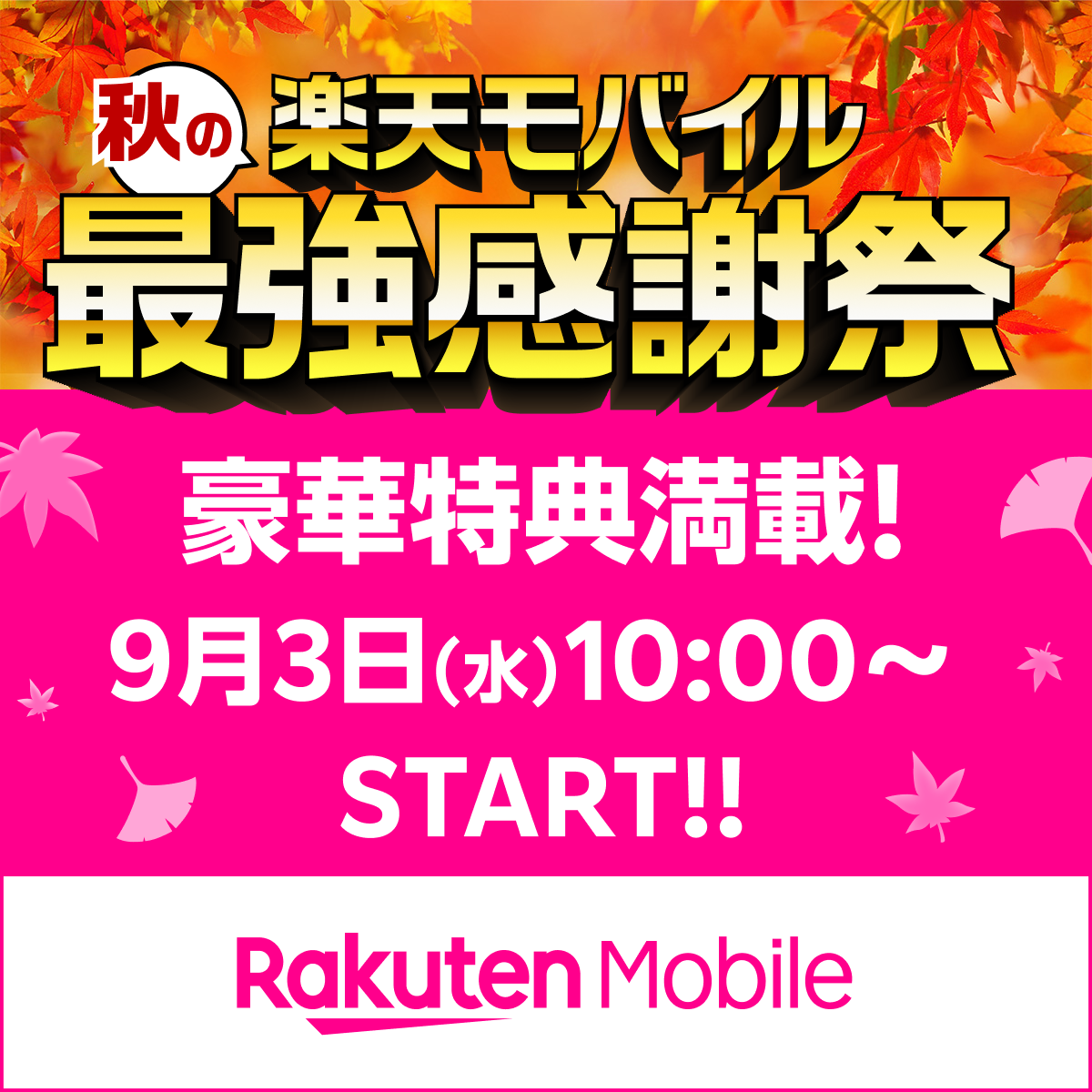 ご訪問ありがとうございます。ただいま楽天グループでは楽天従業員からの楽天モバイル紹介キャンペーンを実施中です。下記からログインして楽天モバイルにご契約いただくと、最大14,000ポイントプレゼントいたします!よろしくお願い申し上げます。https://r10.to/hYYGNa【楽天従業員から紹介された方限定】楽天モバイル紹介キャンペーン!回線お申し込みごとにポイントプレゼント!上記URLからどなたでもお申し込みいただけます。「秋の楽天モバイル最強感謝祭」は絶対見逃せない!食べて!遊んで!買って!楽天モバイルをご利用の皆様、そして、楽天モバイルをご検討中の皆様、朗報です!なんと、契約数が900万回線を突破したことを記念し、日頃のご愛顧に感謝を込めた一大イベントが開催されます。その名も「秋の楽天モバイル最強感謝祭」。楽天市場の大型クーポンから、旅行割引、さらに豪華賞品が当たる抽選まで、毎日が楽しくなるお得な企画が盛りだくさん。この記事では、そんな感謝祭の魅力と、特典を最大限に活用するための「賢い動き方」をサクッとご紹介します。さあ、この秋は楽天モバイルの「最強」特典をフル活用して、日々の暮らしをもっと豊かにしていきましょう!楽天モバイルが契約数900万回線突破を記念して、「秋の楽天モバイル最強感謝祭」を開催します。期間は2025年9月3日(水)10:00〜9月26日(金)9:59。対象は楽天モバイル(Rakuten最強プラン/同データタイプ)のご契約者さま限定で、楽天市場の大型クーポン、旅行割引、ポイントや豪華賞品が当たる企画など“毎日おトク”が続きます。 開催概要 • 期間:2025/9/3(水)10:00〜9/26(金)9:59(日本時間) • 対象:楽天モバイル「Rakuten最強プラン」または「Rakuten最強プラン(データタイプ)」契約者(特典によって細かな条件あり) • テーマ:食べて!遊んで!お買い物!— 日常を彩るアイテムや旅行が“最強価格”に。 目玉コンテンツ(ここだけは絶対チェック)1) 楽天市場の特別クーポン:最大利用で66,000円OFF(先着)クーポン獲得日の2日前時点で「Rakuten最強プラン」契約があることが条件。高額家電やまとめ買いのチャンスです。 2) 旅行予約が毎日 最大20%OFF「毎日」割引チャンス。適用条件は特集ページ内の記載要確認。秋の連休・週末旅に合わせて早めの予約が吉。 3) 豪華賞品が当たる企画(ポイントや人気家電など)9/26終日時点で楽天モバイル契約者が対象の景品もあり。抽選系はエントリーを忘れずに。 4) 毎日当たる!毎週替わるスペシャルオファー(9/3 10:00〜9/25 23:59)デジタルギフトや楽天ポイントが“毎日”当たる。日替わりで当選機会が増えるため、こまめにアクセスを。 おトクを最大化する“5つの動き方” 1. スケジュールを把握:クーポン配布や日替わり抽選は毎日が勝負。スマホのリマインド登録を。 2. 契約状態の確認:クーポンは獲得2日前までの契約が条件。機種変更やプラン変更のタイミングに注意。 3. エントリー癖をつける:山分け/ポイント倍率系は「エントリー→条件達成」が基本。押し忘れ防止に、ページに入ったら最初にエントリー。 4. 高額購入は“まとめ時”に:66,000円OFFクーポンは大型家電・PC・家具などと相性抜群。必要品をリスト化して一気に。 5. 旅行は“日替わりチェック”:20%OFFは対象や条件が変動しがち。週末・連休・学校行事に合わせて毎日覗く。 注意点(よくある落とし穴) • 特典ごとに対象・上限・先着の有無が異なります。詳細条件は各特集/キャンペーンページで必ず確認を。 • 旅行割引の「最大20%」は諸条件あり。予約サイトでの表示・クーポン併用可否に注意。 • 抽選・景品は契約者であることの判定時点が指定されることあり(例:9/26終日など)。スケジュール逆算が大切です。 こんな人に向いています • 家電・家具の買い替えが近い • 秋旅(温泉・紅葉・テーマパーク)を計画中 • 外食やエンタメもポイントでおトクに楽しみたい • ゲーム・アプリの購入予定がある「秋の楽天モバイル最強感謝祭」は、楽天モバイル契約者だけが享受できる“秋のお祭り”。大型クーポンでドカンと値引き、毎日チャンスのポイント&ギフト、旅行割まで、使い方次第で生活コストを丸ごと軽くできます。詳細・最新条件は公式の特設ページを必ず確認してください。 まずは楽天モバイルの契約から、最強特典をフル活用しましょう今回の「秋の楽天モバイル最強感謝祭」の特典は、楽天モバイル(Rakuten最強プラン/同データタイプ)をご契約中の方が対象です。クーポンやポイント、旅行割引を取りこぼさないためにも、まずは楽天モバイルの契約を完了させておきましょう。契約が完了していれば、日替わり抽選や高額クーポン、旅行割などの“最強特典”に参加できます。秋の買い替え・お出かけシーズンを賢く楽しむために、まずは楽天モバイルのご契約からはじめてみてください。秋の楽天モバイル最強感謝祭の詳細はこちらから!https://network.mobile.rakuten.co.jp/lp/link/campaign/ご訪問ありがとうございます。ただいま楽天グループでは楽天