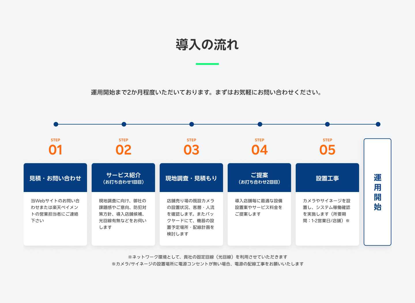 導入プロセスでは、専門の担当者が各店舗の課題や要望をヒアリングし、実店舗での現地調査を実施します。その上で、カメラやサイネージの最適な設置場所や台数を含む個別プランを提案します。導入後も24時間体制の死活監視ツールによってシステムの正常稼働を監視し、不具合発生時には遠隔または現地での調査・整備による保守管理を提供します。また、AIカメラで収集したデータの分析や統計レポートの提供など、オプションサービスも充実しています。