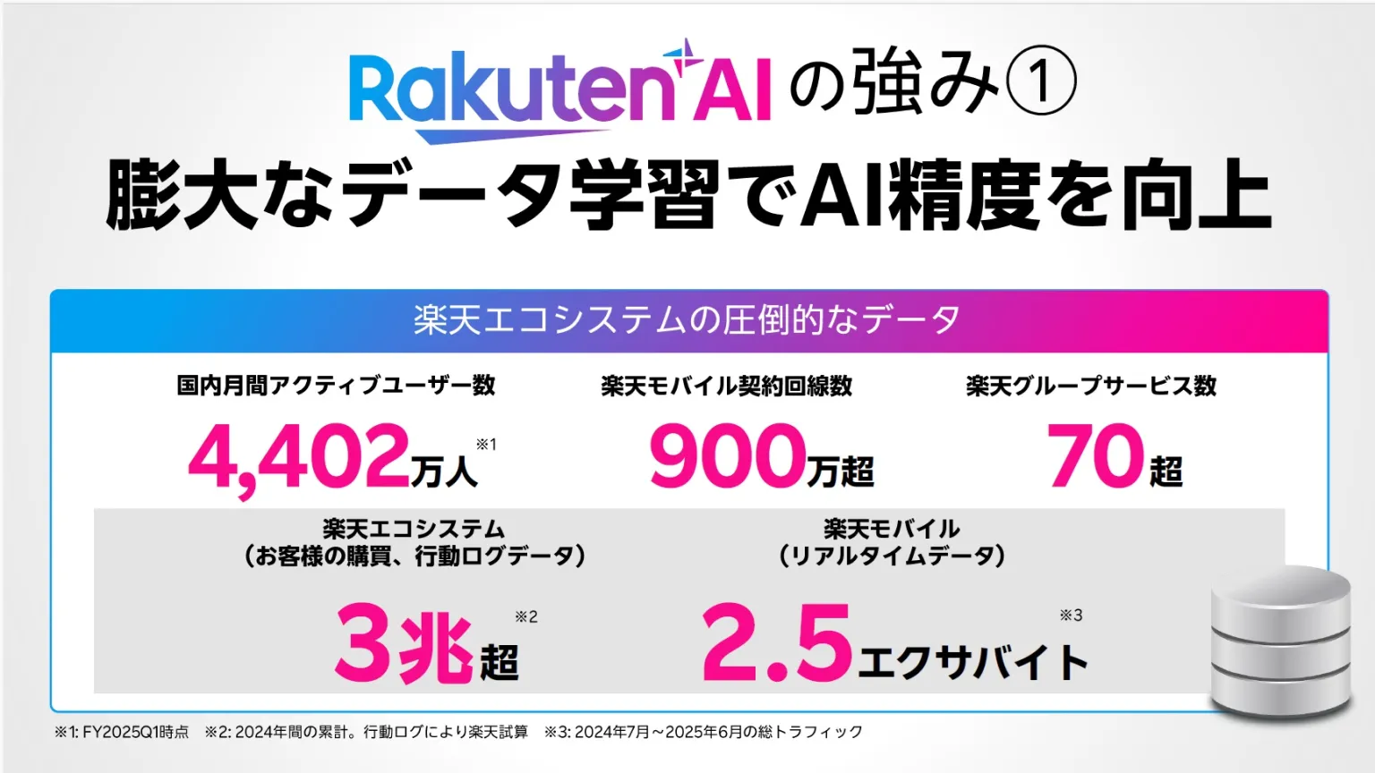 技術面では、OpenAI、Anthropic、Microsoft、LangChain、LlamaIndexといった外部企業との提携により「Rakuten AI」を構築していることが明かされました。同時に、日本語の特殊性を考慮した独自の大規模言語モデル(LLM)の開発も進めており、スマートフォン内で動作する小規模言語モデル「Rakuten AI 2.0 mini」の開発にも取り組んでいます。