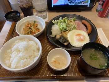 株主優待を利用して主人が よりどりバランス朝定食をいただいたそう。(ごはん大盛りで)山盛りポテトフライも追加したそうで・・素晴らしい食欲の夫 ☆