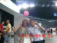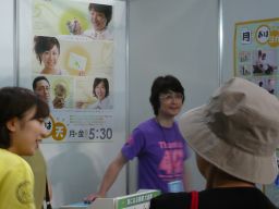 まだまだ引張るぜぃ今日は、ユメミル広場にてステージ以外で見かけたお話したHTB有名人を写真を交えご紹介。朝一番であったのは、HTBアナウンス部長ダンディ遠藤雅也アナマミさんが作るオリジナル料理「菜園野菜のイタリアンそうめん」の整理券争奪じゃんけん大会の場所をスタッフに尋ねようとしたら、遠藤アナでした。f^_^;まだ、誰もいない「おは天」ブースを勧められ、上の写真に横顔写っています、大山ゆうか気象予報士に教わりながら、「アイブラウザ」(画面に触るととか出るやつ。)触ってきました。ん~おもしろかったー。その後、隣にあります「スキップキッチン」前でしばらく待機。すると、おなじみ野菜のソムリエ(中級のベジタブル&フルーツマイスター)のお衣装に身を包んだマミさん登場。これは、料理作っているときのマミさんあぁ~ステキだぁ~。そしてそして、じゃんけんの順番を待っている間、ふと眼を列から逸らすと、そこには、てっ、てっ、てんちょ!da「てんちょ、おはようございます!」て「おはようございます。」そう、挨拶をして、私が右手を構えるとてんちょ きょとん?でも、すぐ理解してくれましたよ。ユメミル広場における私のひとつの目標、てんちょとハイタッチ見事、達成です。まぁね、私の思いが強く、思いっきりハイタッチをしてしまったため、てんちょ、大変痛がっておりました。ゴメンね、てんちょ。そして、てんちょにTAF2008で一緒に撮ってもらった写真渡してきましたよ。受け取ってくれてありがとう。てんちょ。そして、順番回ってきましたマミさんとのじゃんけん。事前にね、マミさん何出すか予告しちゃいましたから、(WEBチェックしてなかったんだよねぇf^_^;)前の人と同じを出して、見事整理券GET。その際、マミさんにも、一緒に川越でとってもらった写真渡してきました。マミさん、受け取ってくれてありがとう。ココまでが、生放送始まる前。ココからは、順不同で、お見かけした方、お話した方、どどどーっと行ってみましょう。ますは、休憩中、CUEブースを見に来ていた、北川さん(写真左)握手してもらいました~~~。写真は、握手してもらった後、会場内に消えてゆく姿をパチリ。隣は、マネージャKBさんかな?CUEブースといえば、STAFF DIARYを書いている皆様がいらっしゃいましたよ。私が確認できたのは、スタッフNさんとスタッフYさん。「STAFF DIARY楽しみにしています。」と、声かけて、何も買わずにその場を離れました。。。他には、onちゃん検定会場で、最後尾のたて看板を持っていた柳田知秀アナアナウンスのお仕事は...クラシックカーの前で記念撮影中のやまだひさしさんちょっと、お話させていただきました、土井Ponちゃんロイズチョコレートを大量にお買い上げ、その様子を記念撮影されていましたHTBの社長。(「社長、社長」と周りから呼ばれていて、ロイズの社長さんかと思っておりましたら、配布された「40周年の挨拶」に載っていた写真の方でした。びっくり。) てんちょを支える店番くまくまさん、ウサウサさん、川越でもお見かけしました森山良子さん似のジンジンさん、ワンサカかな?撮影中のHide-c.さん&吉田理恵アナそして、そして、放送終了後、会場に現れてくれましたう先生紫色のTシャツを着たう先生。あぁもうブレブレです。。。ふ先生茶色のTシャツ、ふ先生。そして、ふ先生のお母様。たくさんの方に出会えたユメミル広場でした。
