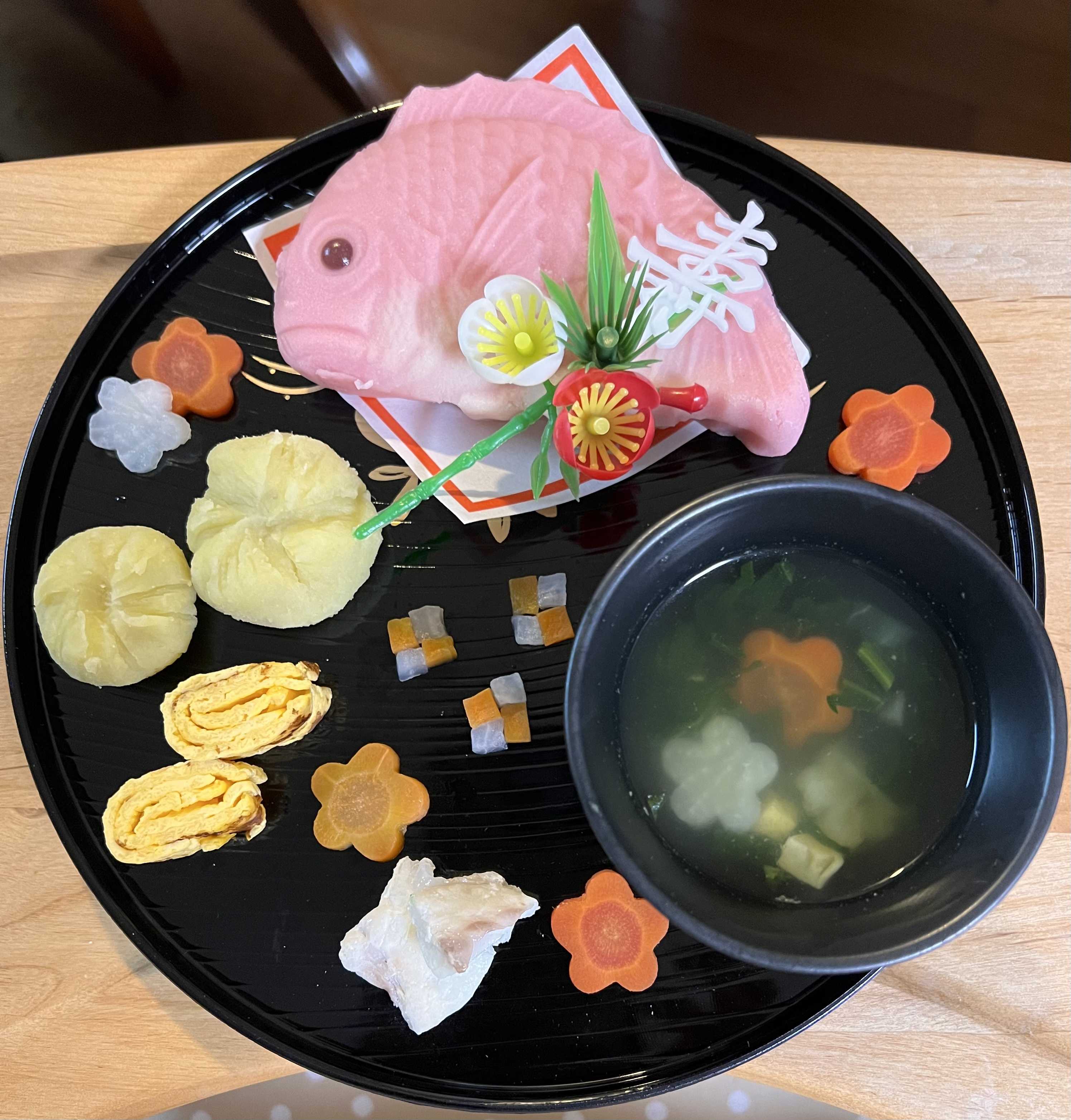 離乳食おせち(*^◯^*)メニュー📝飾り梅の花・市松模様は、にんじんと大根を出汁で柔らかくりんごとさつまいもの茶巾りんご(1/8個、いちょう切り)とさつまいも(1本、輪切り)を適当に切って、鍋へ。かぶるくらいの水を入れて、水分がほぼなくなるまで炊く。ザルでうらごして、ラップにくるんでひねる鯛 出汁で茹でるだけ卵焼き卵黄2個、出汁少し、パン粉or砕いたお麩、ミルク20ml薄焼きたまごを作ってくるくる巻いて、ラップにくるんでおくお吸い物大根、にんじんは小さいさいの目切り(食べられるサイズに)、チンしてやわらかくしておく出汁に大根とにんじん、ほうれん草、豆腐をいれて醤油を2滴たらして一煮立ち余ってた飾りの大根とにんじんも入れてみたら華やかで可愛くなった〜😆ピンクの鯛は、売ってた和菓子を飾りとして。母のおやつになります。笑