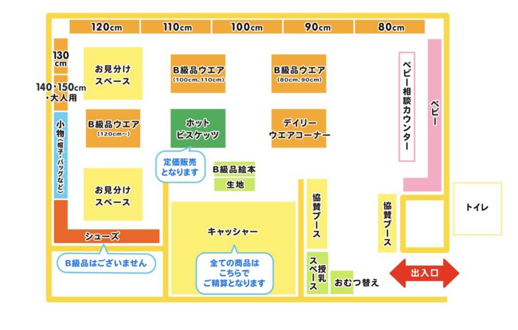 抽選に外れちゃったので朝、6時に出発😂9:40頃会場に着いて、人はまばら。まだ列もできてませんでした〜。今日は10時オープンだったそうで、9:45〜抽選入場、一般入場ともに並ぶところへの案内開始😀一般入場の列の4番目くらいだったのかな。営業時間は10:30〜17:00で予定通り10:30くらいのINだったと思う。(時計見てなかったー)前もって情報収集してたら一般で入った頃には90の棚はほぼ何もないっていう情報がいっぱいで我が家は80とシューズ狙いだったのでドキドキ💗しながらの参戦でした。マップ私はシューズ、お義母さんはB級ワゴンのところへ。旦那氏は割引のそんなにないコーナーにいた(笑)…たしかに可愛いけどね、定価だと高いのよ。どれもこれも、可愛い〜〜〜!安い〜〜〜!で、とりあえず良いなと思ったのをどんどん袋へ。サンダル欲しかったけど、12.0cm〜でした。えだまめちゃん、11cmなのですよ🥲あーあ。残念。といいつつ、12cmのサンダルや靴を4足キープwそして旦那氏たちと合流して、厳選です。とりあえず選んできたものの総額は7万越えwセール、こわ😱あれもこれも可愛い欲しい言ってたらアカンそこからさらに時間をかけてこれ可愛いだの割引が少ないだの相談して5万円代まで減らしました。セール、こわ😱感覚麻痺しとるやん完全に😱そして旦那氏がレジに並んでくれてる間私は1人で改めてゆっくり会場をまわってみました。90と110のワゴン、なんもない。見事になんもなかったよ‥。帽子とか小物も大人気な感じ。麦わら帽子とか可愛かったな〜。で、もう一回シューズコーナーに行ってなんとなく手に取ったのが11.5cmのサンダル(もといサマーシューズ)13cmのワゴンに紛れてて。たまたまよ。あるやん!!!!!!!!←このテンション。レジ待ちの家族に合流して、キープしてた12cmのサンダルとチェンジです。7,900(税別)→→5,53030%オフ♪ラッキーで目的果たせました😭よかった〜。