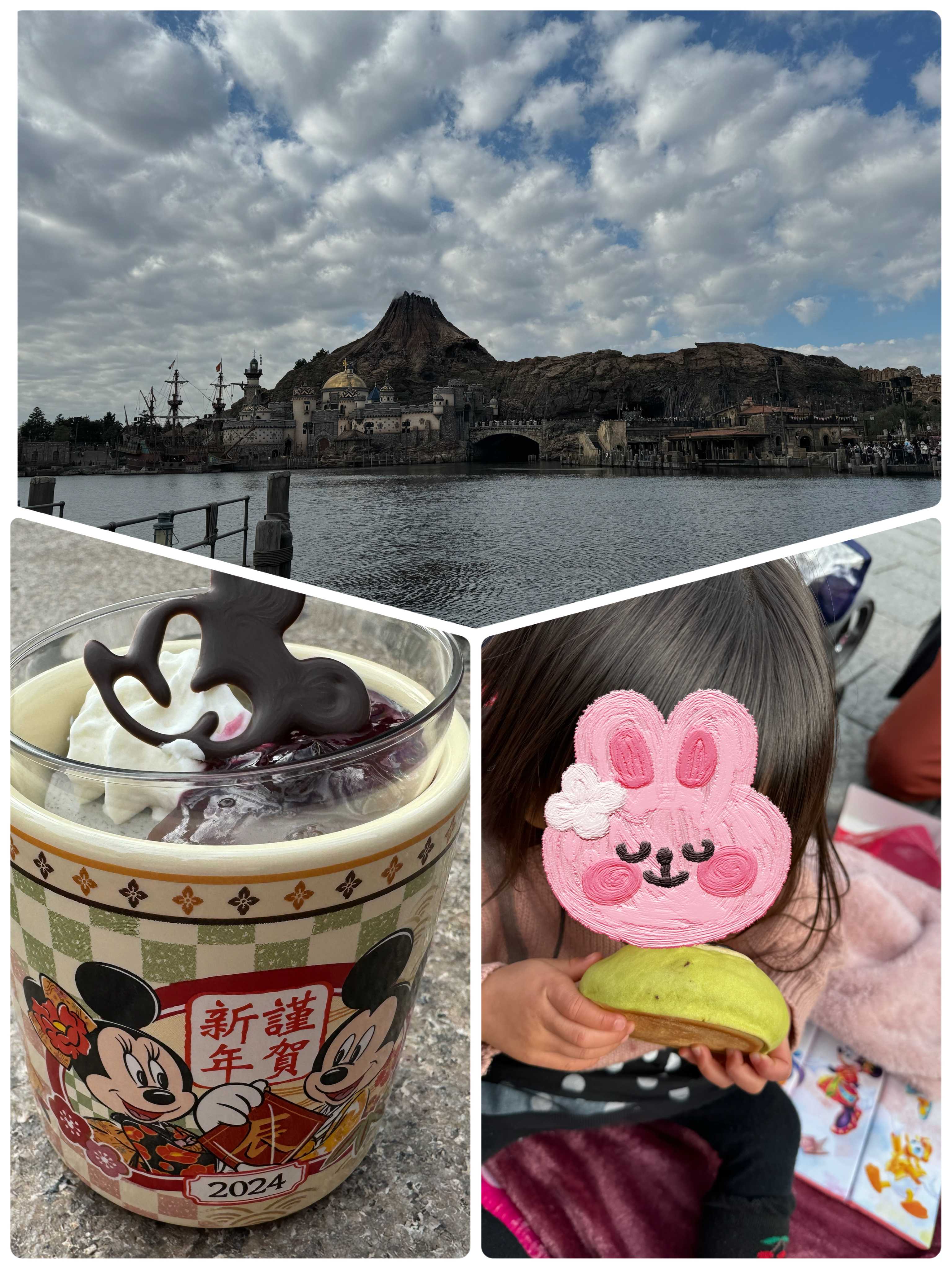 3日間、欲張りなことにギチギチに詰め込んで予定こなしてあちこち移動するからもーーしんどかった😇1日目。ディズニーシー(バケパ利用)到着してすぐマンマビスコッティーズベーカリー🥐へ。お正月のスーベニアが欲しかったのよー!とても良い(*^ω^*)♡フリードリンク券でコーヒータピオカラテ(¥600)もゲットパンとおやつを朝ごはんにしつつ、ミッキー広場一列目でお正月グリのお地蔵さん。そのあとはケープコッドクックオフでクッキーアンのオレンジ&ティーゼリードリンク(¥700)もフリードリンク券を利用。ホットで、めちゃくちゃ甘くて、オレンジは皮ごとまるごと食べられるっぽいよ✨(知らないけど、食べたよ!)ケープコッドクックオフ並んでたらお店のお姉さんが、隠れミッキー探してみてね♡と声をかけてくれましたずんずん奥へと進んでいってロストリバークックハウスで、大っっ好きなスパークリングタピオカティー マンゴー(¥500)フリードリンク券でゲット。時計回りにずんずん進んで、サルタンズオアシスではホットチョコレート&オレンジ(¥600)フリードリンク券♪もうすでにフリードリンク券2,400円分使ってるぅ♪ そのほか、ホットのウーロン茶(¥300)にも結構使ったよ。午後からは一旦退園してアンバサダーホテルへ。チックタックダイナーのスペシャルブレッドでかー!そして予約していたハイピリオンラウンジでミニーちゃんのハイティーセット♡♡♡かわいすぎた…🥺サラダのね、大根?お野菜がね、ミニーちゃんだった//夜はエンパイアグリルのテイクアウト。お正月バージョンてことでめちゃくちゃ豪華(値段もやべー。)取りに行くと、こんな感じで受け取ってとにかくボリュームがすごかった(@ ̄ρ ̄@)