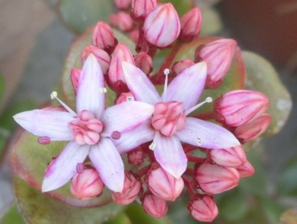 緑色で縁が紅色を帯びるが、紅色にならない変種もある。 淡桃色で星形の花を
