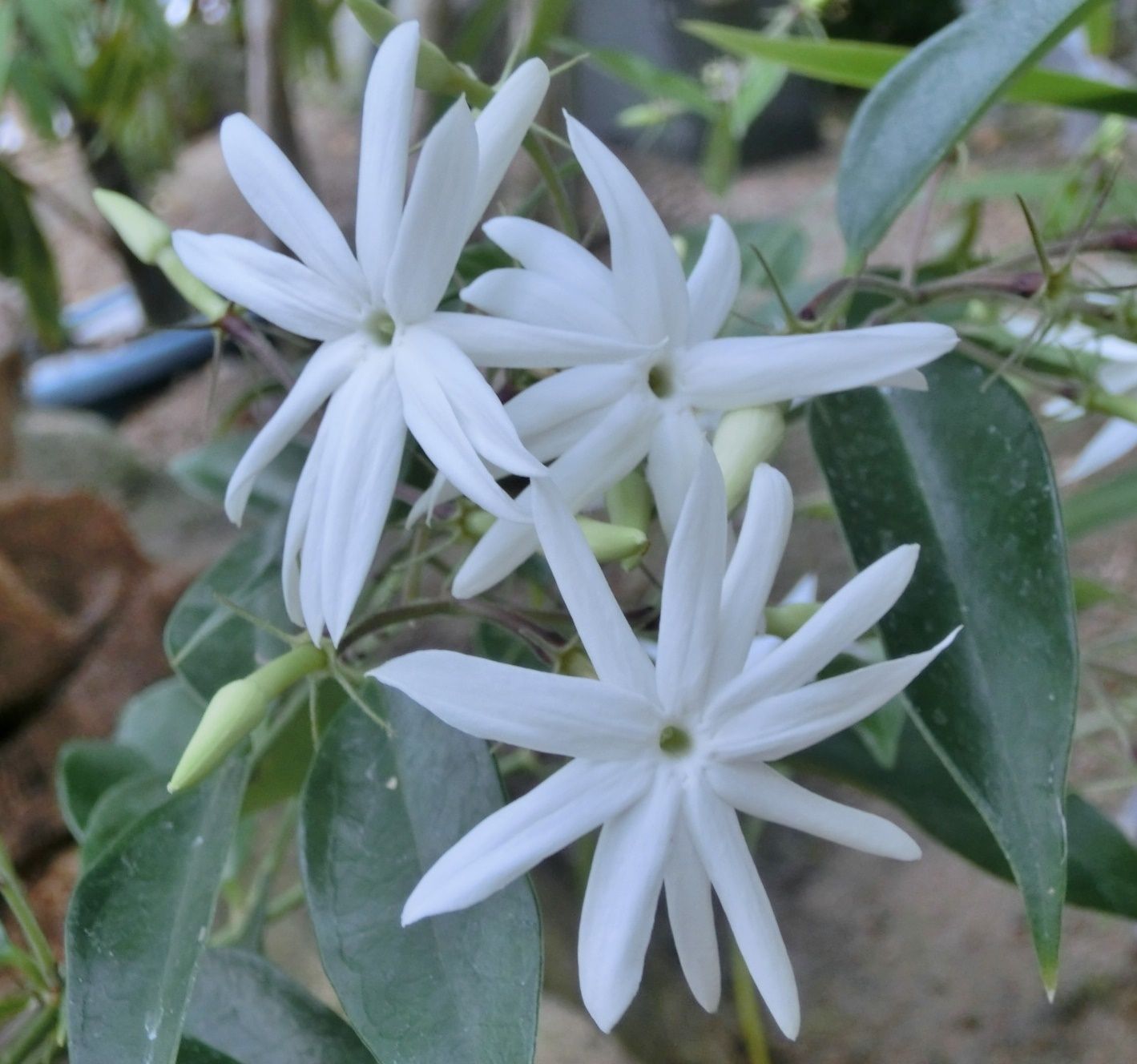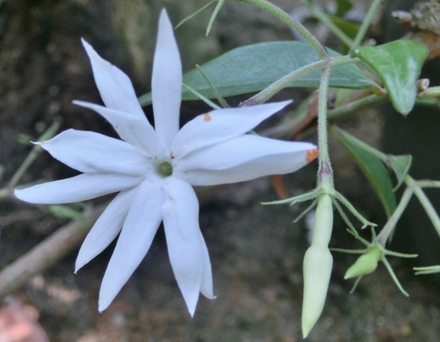ジャスミンの仲間で、晩春から夏にかけて純白で芳香のある花をつけます。