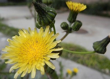花期は春から秋で黄色のタンポポのような花が咲きます。 葉には刺があるが
