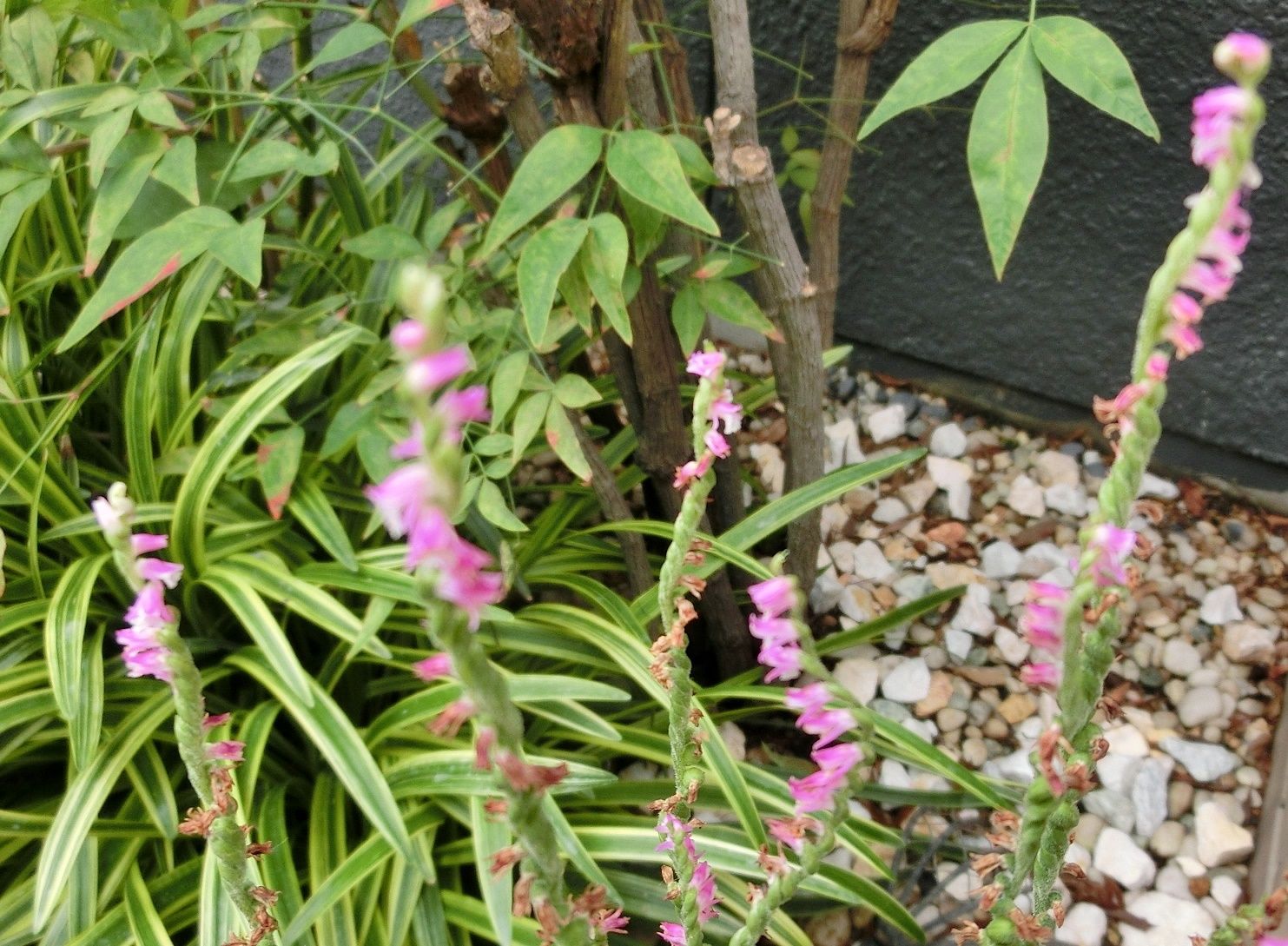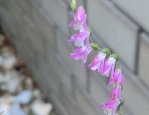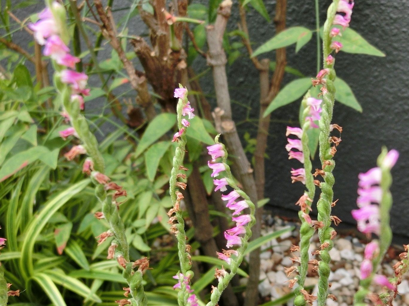 ねじれた花序をつけ、ねじれは左巻き、右巻きと両方あります。