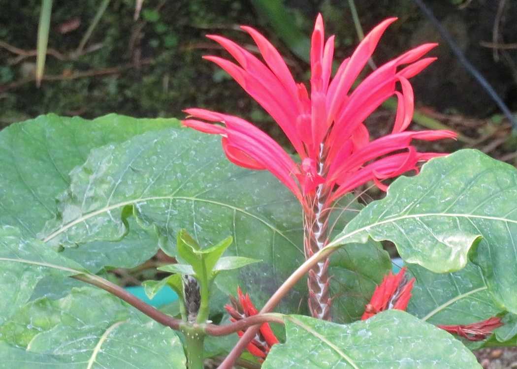 赤橙色からオレンジ色の筒状の花が、花茎から突き出して咲き、