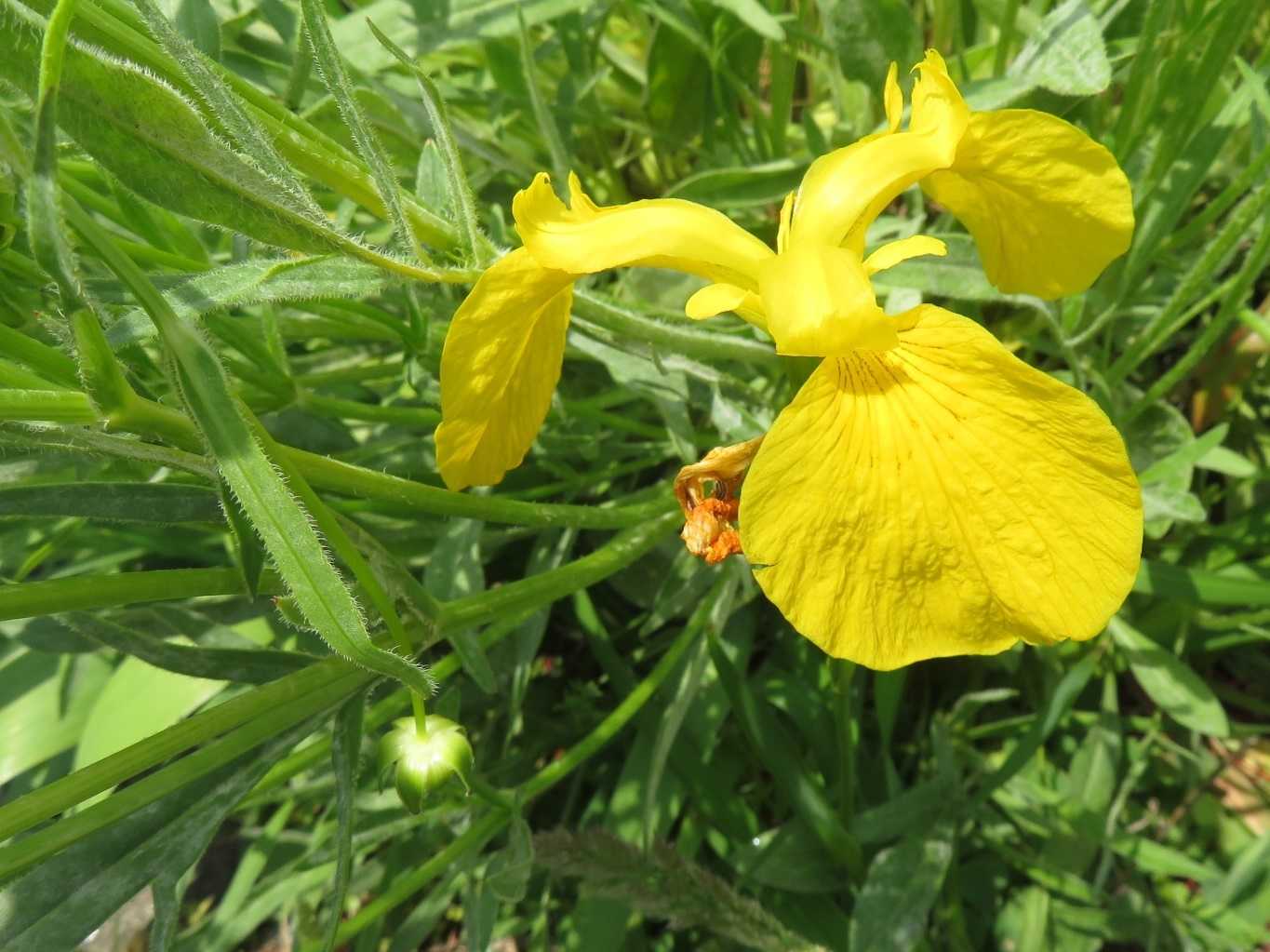湿地に生え花色は黄色。 葉っぱは細長く、縦に筋(突起した脈)が あります。