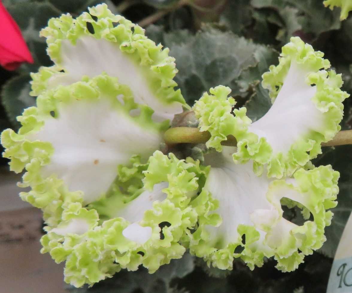 白い花弁の縁にグリーンの細かなフリンジが入るバラ咲きシクラメンです。
