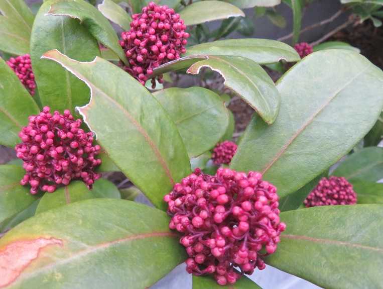 小さな白花も実も、濃い緑の葉とのコントラストで美しい新しい花木です。