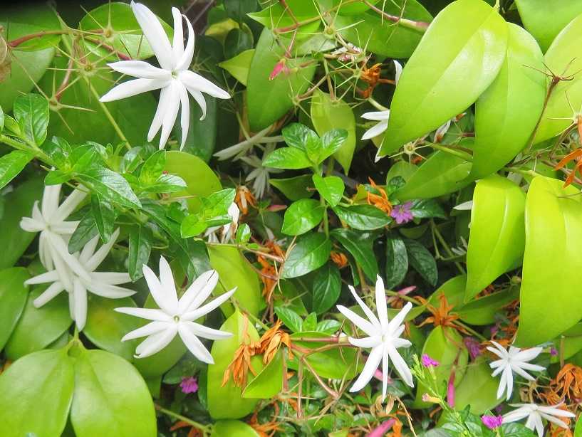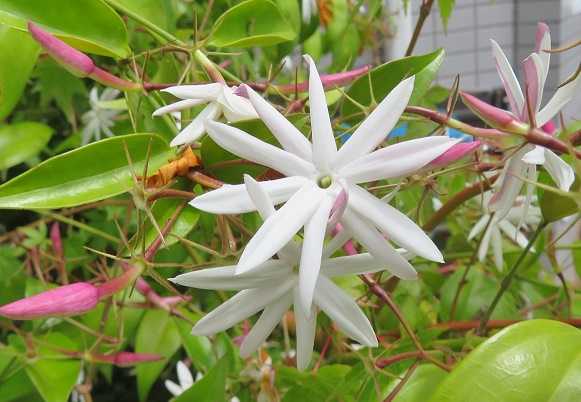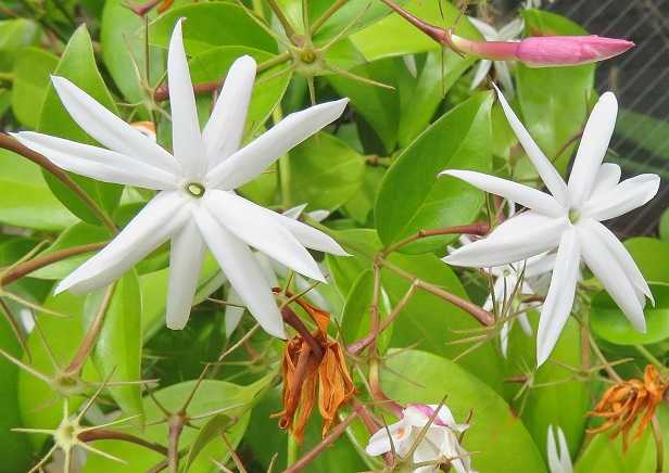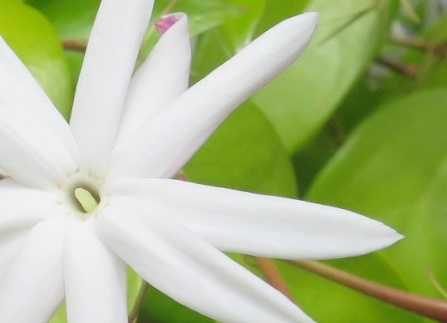 ジャスミンの仲間で、晩春から夏にかけて純白で芳香のある花をつけます。