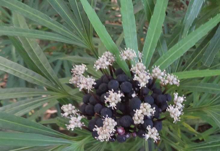 果実が見えてくる頃、その下から雄花が伸びて咲き出します。 果実は黒紫色から