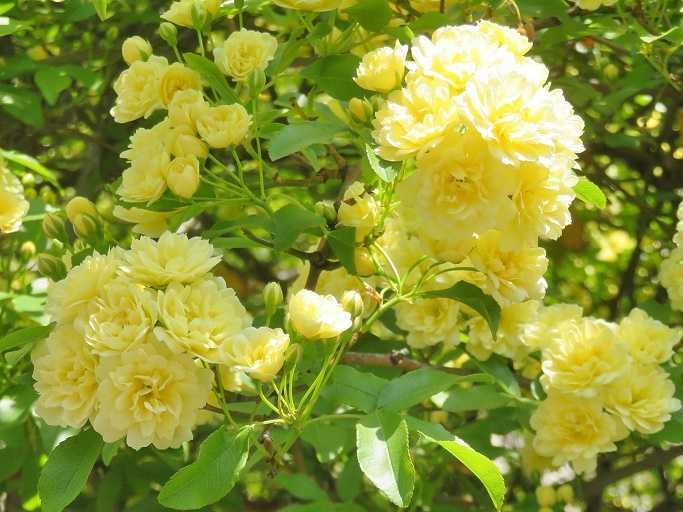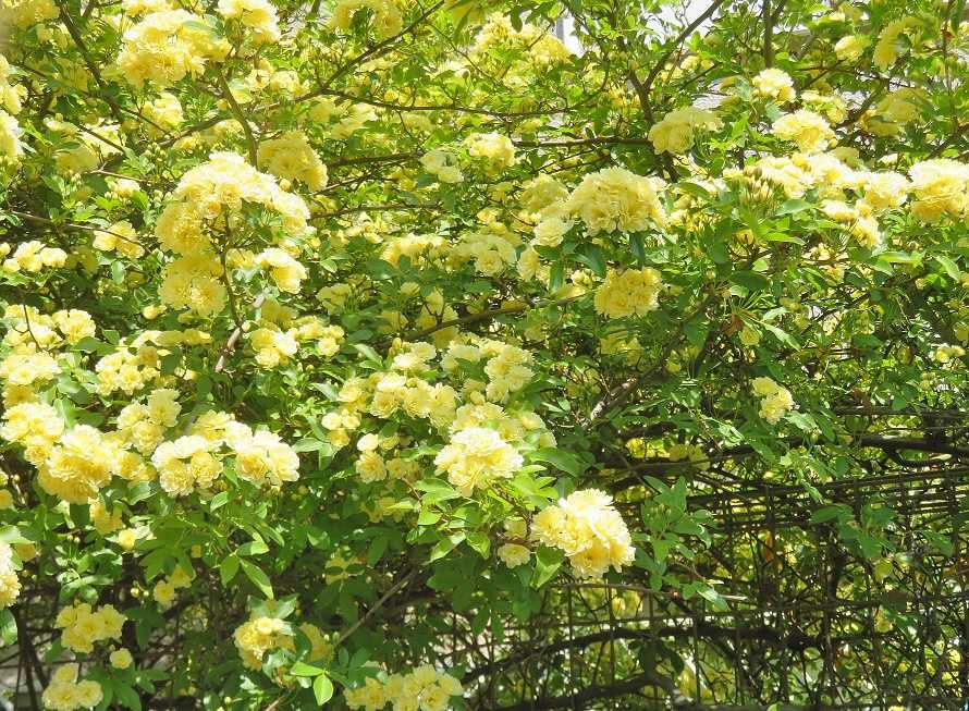 たわわに咲いた白や淡い黄色の花は、庭のアーチやフェンスを華やかに演出して
