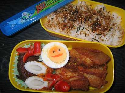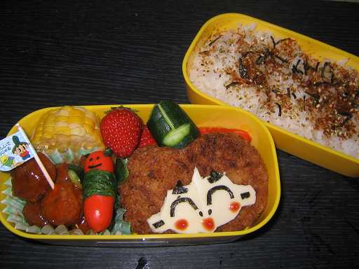 晶の要望で今日のお弁当はおじゃる丸に決定~♪チーズ切って~♪キュウリ切って~♪のりで目を作って~・・・でんぼもウインナーとほうれん草で作って~・・・なんかお弁当作ってるっていうよりもはや工作してる感じやの~(ΦωΦ)(゚Д゚ノ)ノビクッッッ!! ・・・・・でんぼに見えない(´;д;`)何故だ?細いウインナー使ったからか?そういえばでんぼは太っちょだったような・・・しかも赤いウインナーだからか!?・・・・・まっいいか~(適当)なにはともあれおじゃる丸弁当出来上がり!!晶、大切にお弁当かかえて幼稚園に出かけましたとさ♪♪♪♪