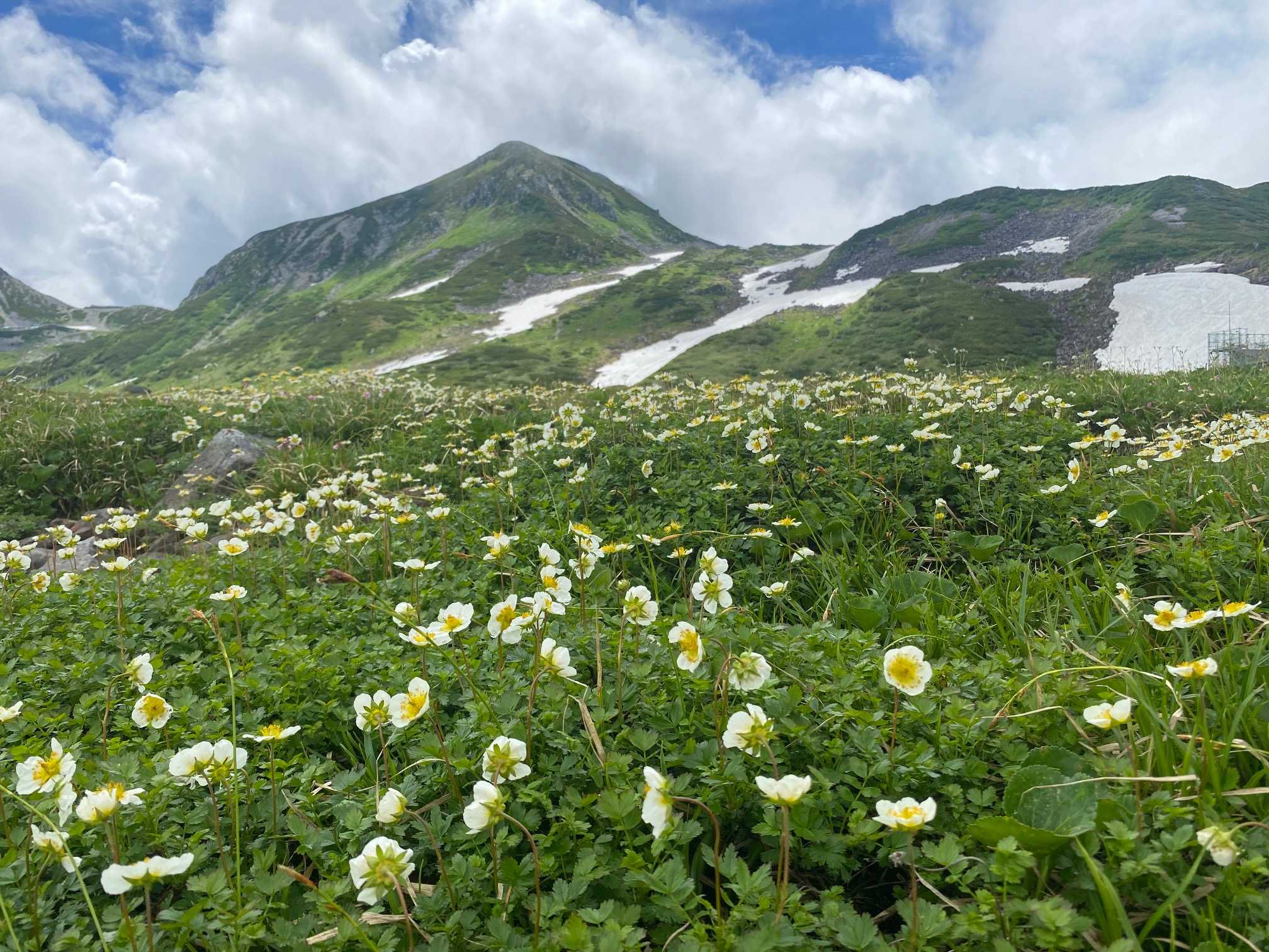 代表的な雪田植物の一つです。高山帯や亜高山帯の地形的に緩やかな凹地では遅くまで雪が溶けずに残り、植物たちは雪解け直後から生長を開始し、花を咲かせます。