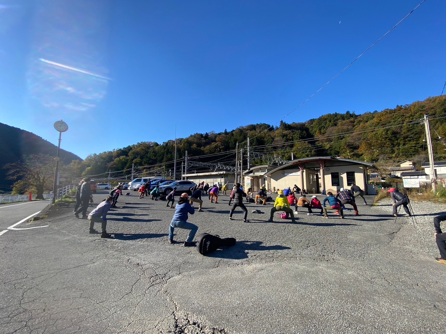 日本山岳会山梨支部の平松清子さんの指導で朝のストレッチ