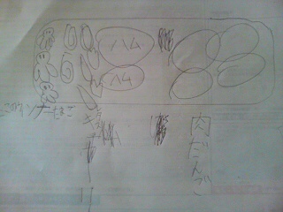 小学校始まったとおもったら はやくも遠足 ママ出張中で レオ君の遠足弁当係 学校の通達をみてみると 手作りと書いてあるぞ あたしの好みだと酒の肴になりそうなんで レオ君に どんなのがいいか 実物大設計図を書いてもらった なるほど 図にすると簡単だな 彼と近所のスーパーにいってみると あら お知り合いのママさん あちらも あら!? あら! だけで 弁当の具材仕入れにきてるのが解る始末 どことも同じですな おおでけたでけた ビジネスとおんなじで 描いて行動ですな 彼も今度は一人でできるな はやく大きくなってくれよなあ・・・