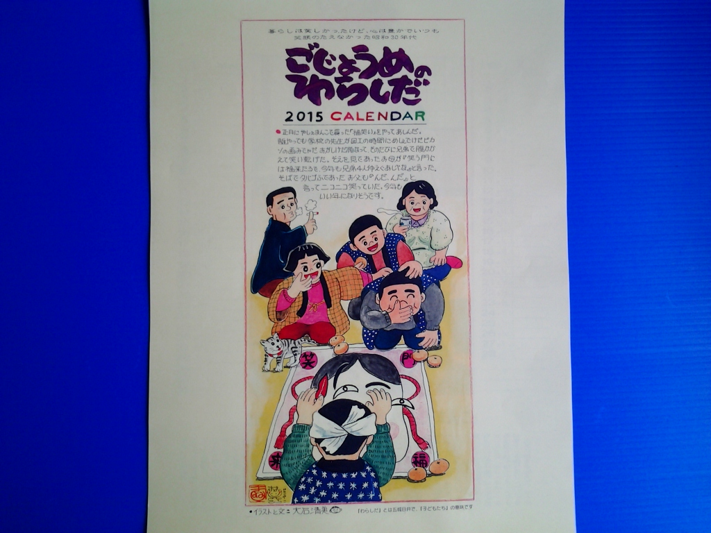 ■ このだびも!買わひで頂きましたァ・・・ 2015年 「ごじょうめのわらしだ(五城目の子供たち)」・・・ 鮮やかな!フルカラー・・2ヶ月、6枚綴じり。 30 センチ X 42 センチ 一冊 1500円 ◎ 今後!機会がありましたら・・・ このページで、ご紹介したいと思っています。 今日の写真は、その「カレンダー」表紙です!・・・。 私にとっては!表紙も交え、貴重な「文化遺産!七枚」ですので・・・ それは!それは、腫(は)れ物にでも触るように、汚れないように!日焼けしないよう・・・ 一年が過ぎるのです(笑)。 その昔・・ご先祖さまたちの原語には!そのコミュニティーのみに通用する暗号!秘密の言葉があったのですッ・・ ずーづう弁!・・とんでもありまひん、無味乾燥?標準語の御言葉では・・その感性までをも、お伝えすることはできまフぇん。 この「カレンダー」の作者!「大石画伯」は、過去の人に非ず!・・・ 私たちコミュニティーの「未来人」なのであります・・(笑)。 健康一筋39年。 お!茶しま専科健康通販倶楽部を応援しています。 http://ww w.rakuten.co.jp/daiichi/