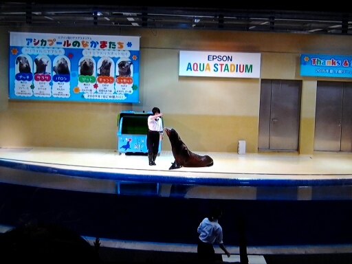 ■ 正式な!名前が難しく、いつもの会話の中では「品川水族館」・・こりゃ!忘れない・・ としのせい?・・ 「エプソン品川アクアスタジアム」じゃよ。 一見!・・古代ローマの遺跡を彷彿とする!見事な円形は・・当館誇る「イルカショー」・・・・・ そのイメージに隠れ!敢えて二番座のエースをつとめる・・・ 優雅をかもす!見事な半円形舞台「アシカショー」・・・■ 共演!言葉巧み・・ジョークの上手な女性パーナーとの掛け合い!・・・ 氷の上かと思わせる、きれいな床を!滑り歩く、敏捷(びんしょう)な身のこなし・・・ やはり!ここにもある・・・別世界・・(笑)。 会場の盛況さは異常なもの!・・幼年の子供たちの興奮が伝わってきた・・・ 私も!もしかして・・昭和の20年代に!こんな「遭遇」があったら・・・ さぞかし!人生も変わっていたろうなぁ・・と、込み上げて来るものを感じるた(笑)。 健康一筋39年。 お!茶しま専科健康通販倶楽部を応援しています。 http://ww w.rakuten.co.jp/daiichi/