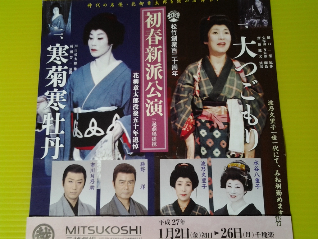 ■ 新春の行き処!・・今年は東京でありました。 御上りさんの行き着く処!女房殿の「銀座」ウインドーショッピングに止まらず・・・ 日本橋!三越本店・・三越劇場・・・時は初日の1月2日。 松竹創業 百二十周年 「 初 春 新 派 公 演 」(写真) 花柳章太郎没後五十年追悼」 演目 一、「大つごもり」・・・ 二、「寒菊寒牡丹」・・・ 水谷八重子、波乃久里子、勝野洋、市川月乃助・・その他。■ 年の瀬の秋田は!寒波到来と言えども・・・ 積雪やや不足、一年の計!元旦にありと・・・ 降りた東京は!小春日和・・・ 観劇であらわれた心を以て!新年の慶賀をお祈りしたい!・・・(笑)。 健康一筋39年。 お!茶しま専科健康通販倶楽部を応援しています。 http://ww w.rakuten.co.jp/daiichi/
