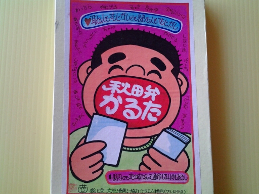■ 秋田で!最も有名人のお一人・・・ 「大石 清美(おおいしきよみ)さん」をご紹介しよう・・・ 印刷業を営み、「エフエム椿台」のラジオ番組「ばんげだい椿台」のパーソナリティーも兼務!・・・ 将又(はたまた)!今日の写真・・・ イラストレーターとしても、抜群の感性・・・ 昭和30年代を物語る!・・「あきたのわらしだ」(秋田の子供たち)・・・の作者でもあるのです。■ 平成8年からと聞く!氏の「作品」は、数えきれない・・・ 毎年のカレンダー(2ヶ月6枚)、某役所の広報、商業用ポスター、チラシ・・・。 中でも!傑作中のけっさく・・「秋田弁かるた」・・・ 秋田弁以外しゃべれねぇ!オレですらァ・・ながなが読めねぇ、秋田弁の原語だすッ!。 これに、音符・・♪ をつけると、ドイツか、イタリアでは標準語として!通用するって・・どいつか!、しゃべッでだなァ・・・ 聞だごどある!・・・(笑)。 健康一筋39年。 お!茶しま専科健康通販倶楽部を応援しています。 http://ww w.rakuten.co.jp/daiichi/