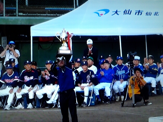 ■ 「今大会から!内閣総理大臣杯」登場・・・ (11) 開会式の冒頭に!式典扇の要、ホームベース上の位置から・・・ 写真、高々と持ち上げられ、球場内参集の4700名を越える選手、観覧席にはその応援家族、近隣の観客・・合わせ5000人の見つめる中で紹介されました。■ 大会のルーツは、第1回大会の前年!神岡町にお住まいの、当時の県野球協会会長・高橋政泰さん(故人)の呼び掛けで・・・ 同町神宮寺地区の50歳以上の選手で行った「紅白試合」が、そのきっかけ・・!。 翌79年7月には、同町と周辺地域の6チームで!・・・仙北郡大会を開催。 これが大きな反響を呼び、同年秋の「全県大会開催」につながったというのです・・・。■ 大きな大会に、「大きな優勝杯」・・否(いや)が応でも盛り上がる「秋田県大仙市大曲」・・・ 熟年パワーの炸裂は!先の「日本一花火」と共存・・発展してほしいものです。■ "From this tournament! The Prime Minister cup" appearance... (11) In the beginning of the opening ceremony! From the location on the linchpin and the home base of a ceremony fan... It was lifted with high schools and while 5000 people of audience.. adjustment of the support family and vicinage was looking at a player beyond 4700 people of gathering in the stadium in a seat, it was introduced.■ Roots of a meet is the last year which is a meet the 1st time! It's a call of a prefecture baseball society chairperson and Mr. Masayasu Takahashi in the those days when you're living in Kamioka-machi (people who passed away).... The "contest between two groups" performed by more than 50-year-old player in the said town Jingu-ji area, the trigger..! It's by the said town and 6 teams in a circumference area in July, next 79!... Senboku-gun meeting is held. This has a big public response, and I say that it led to "whole prefectural tournament holding" in the same year autumn.... 健康一筋 お!茶しま専科健康通販倶楽部を応援しています。 http://ww w.rakuten.co.jp/daiichi/