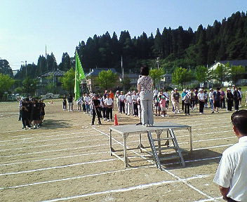 ■ 大人達が主動する運動会に、子供達が大勢参加し、校長先生が来賓の挨拶(写真)する。