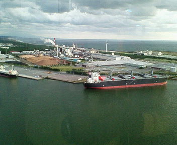 ■ 見たこともない、小島のような巨大タンカー、パルプ原料の木材チップを運んで来るとか。
