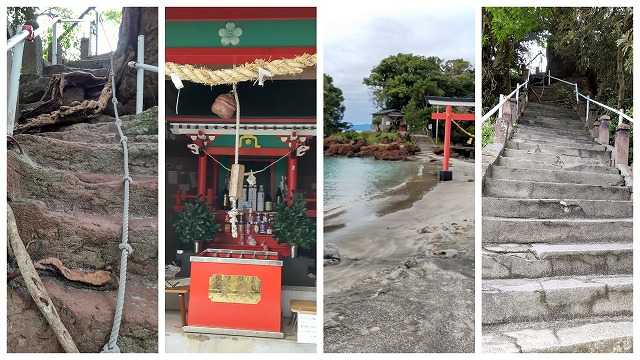 潮の満ち引きや時間帯、季節によって様々な表情を見せてくれます。拝殿まではロープを頼りに急な階段を登ります。また、満潮時に拝殿までの道がなくなってしまうので気をつけて。